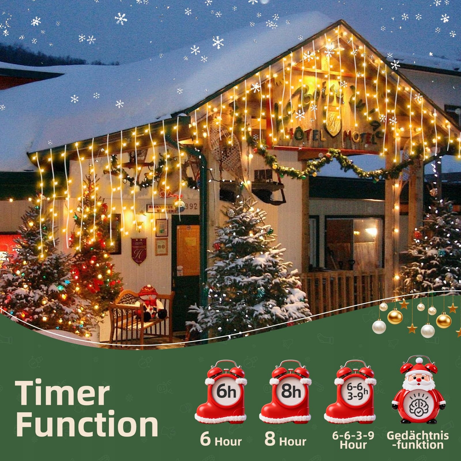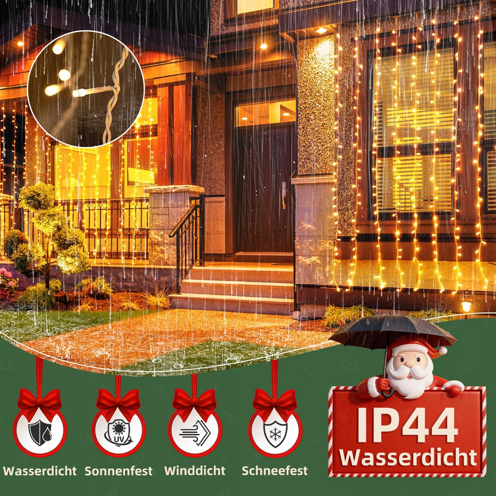 【Wszechstronne możliwości dekoracyjne】: Ta dekoracja świąteczna na zewnątrz doskonale nadaje się do drzew, ogrodzeń, balkonów lub elewacji. Używaj jej w okresie świątecznym, na letnie imprezy lub jako stałe oświetlenie ogrodowe. Ciepłe białe światło (2700K) tworzy przytulną atmosferę, a 8 trybów świetlnych ożywia każde wydarzenie. Łańcuch świetlny można również stosować wewnątrz, aby tworzyć cienie w pomieszczeniach. Dzięki 50 opaskom montaż jest bardzo prosty, a dzięki elementowi łączącemu możesz łatwo rozszerzyć łańcuch o drugi, aby oświetlić jeszcze większe powierzchnie.
