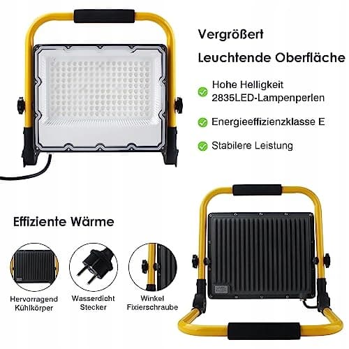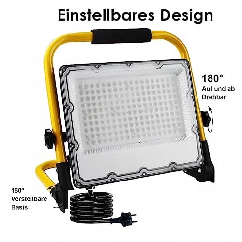Przenośny i elastyczny design: Nasz reflektor LED ze statywem posiada regulowany uchwyt, który umożliwia regulację kąta oświetlenia o 180 stopni w górę i w dół, co ułatwia dostosowanie kąta światła. Dodatkowo oferujemy wysokiej jakości wtyczkę Schuko i 4-metrowy kabel zasilający, co pozwala na podłączenie lampy do każdego standardowego gniazdka