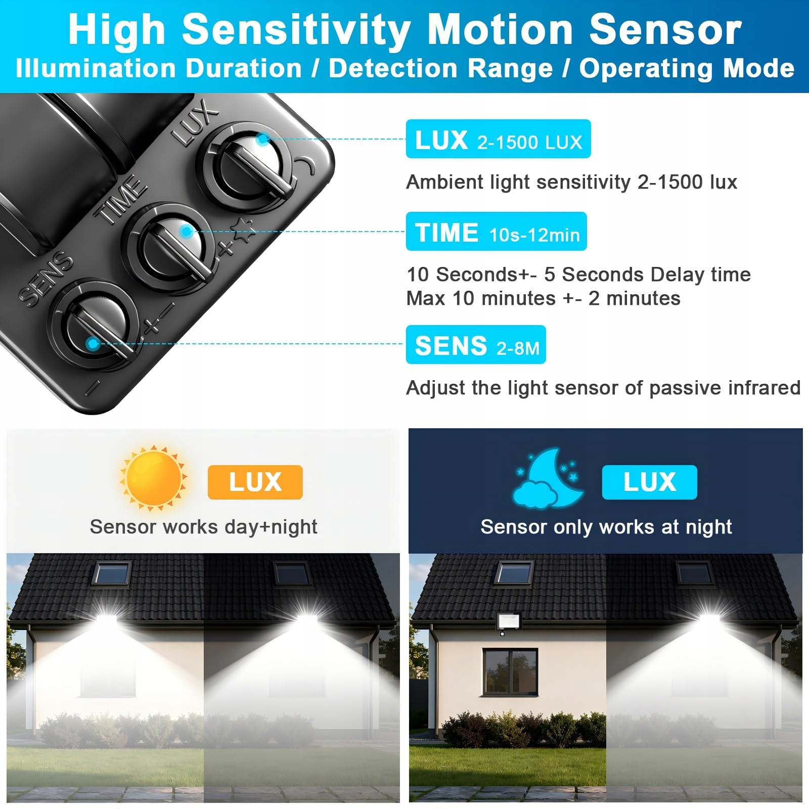 【3 regulowane tryby wykrywania ruchu】Nasz LED reflektor z czujnikiem ruchu, z trzema trybami wykrywania: TIME, SENS i LUX. TIME: ustawienie czasu opóźnienia czujnika (10S-12min). SENS: regulacja czułości czujnika (2-8m). LUX: ustaw na '🌞', aby czujnik działał 24 godziny na dobę. Ustaw na '🌛', aby czujnik działał tylko w nocy. Czuły czujnik ruchu można ustawić o 180° w górę/dół, 360° w lewo/prawo