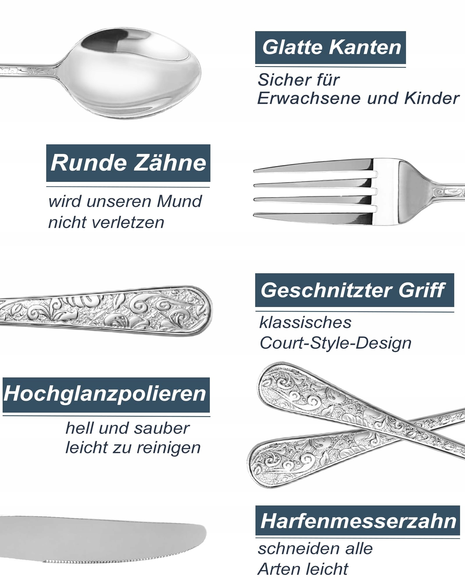 SHEUMNT 24-częściowy zestaw sztućców w stylu vintage ze srebra z rzeźbieniami dla 6 osób, sztućce ze stali nierdzewnej z nożem/widelnem/łyżką, zestaw sztućców do domu i kuchni, wysoki połysk