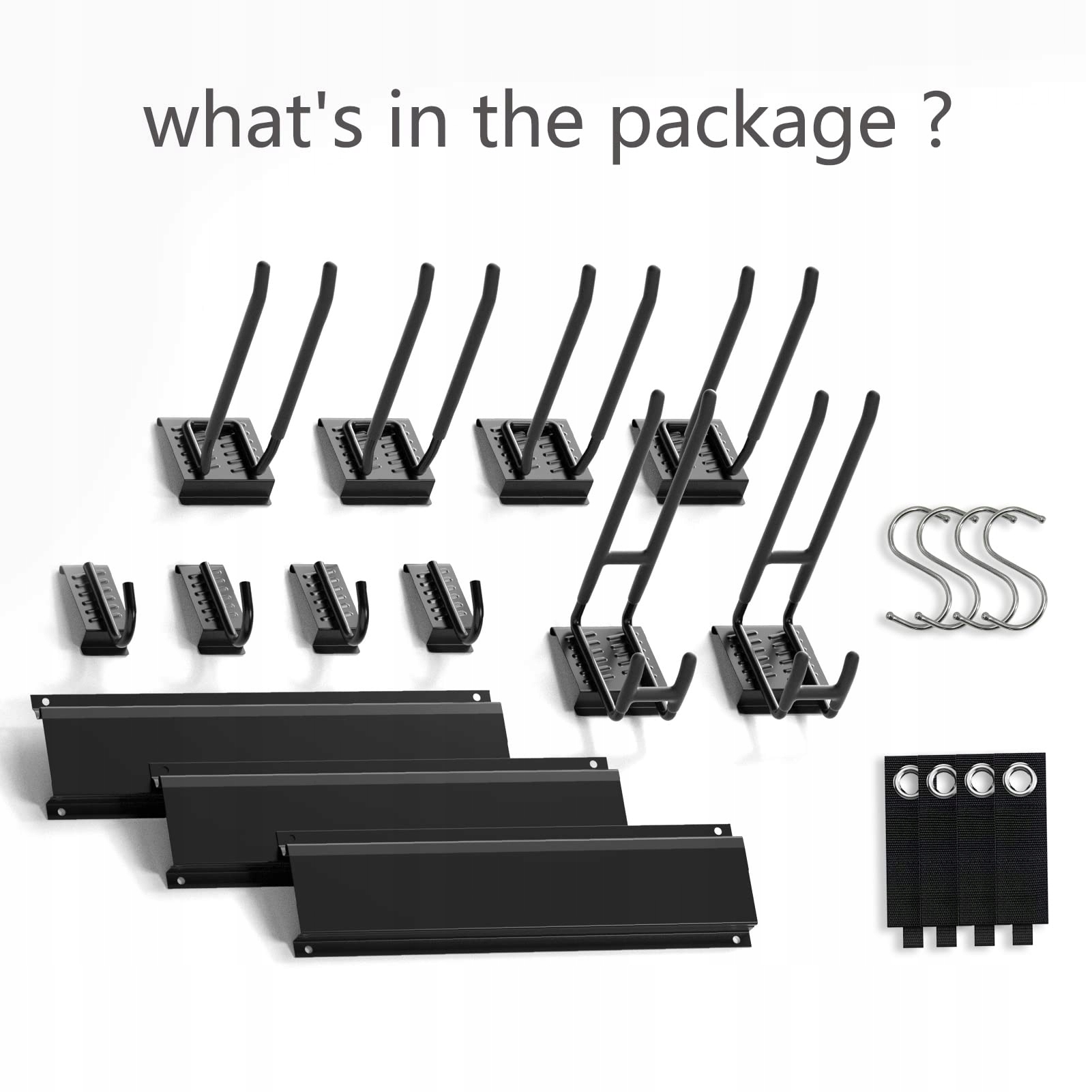 Różnorodny wybór haków: Uchwyt na narzędzia jest wyposażony w 3x 40 cm szyny, całkowita długość 120 cm. A także 2 podwójne długie haki, 4 haki do narzędzi elektrycznych, 4 małe haki J, 4 haki S, 4 pasy do przechowywania, śruby i rury rozciągające. Podwójne stalowe haki mają długość 26 cm, co może zwiększyć pojemność przechowywania o 100%. Ten uchwyt ścienny garażowy wykorzystuje niewykorzystaną przestrzeń na ścianach garażu, aby utrzymać garaż lub szopę w porządku i przejrzystości
