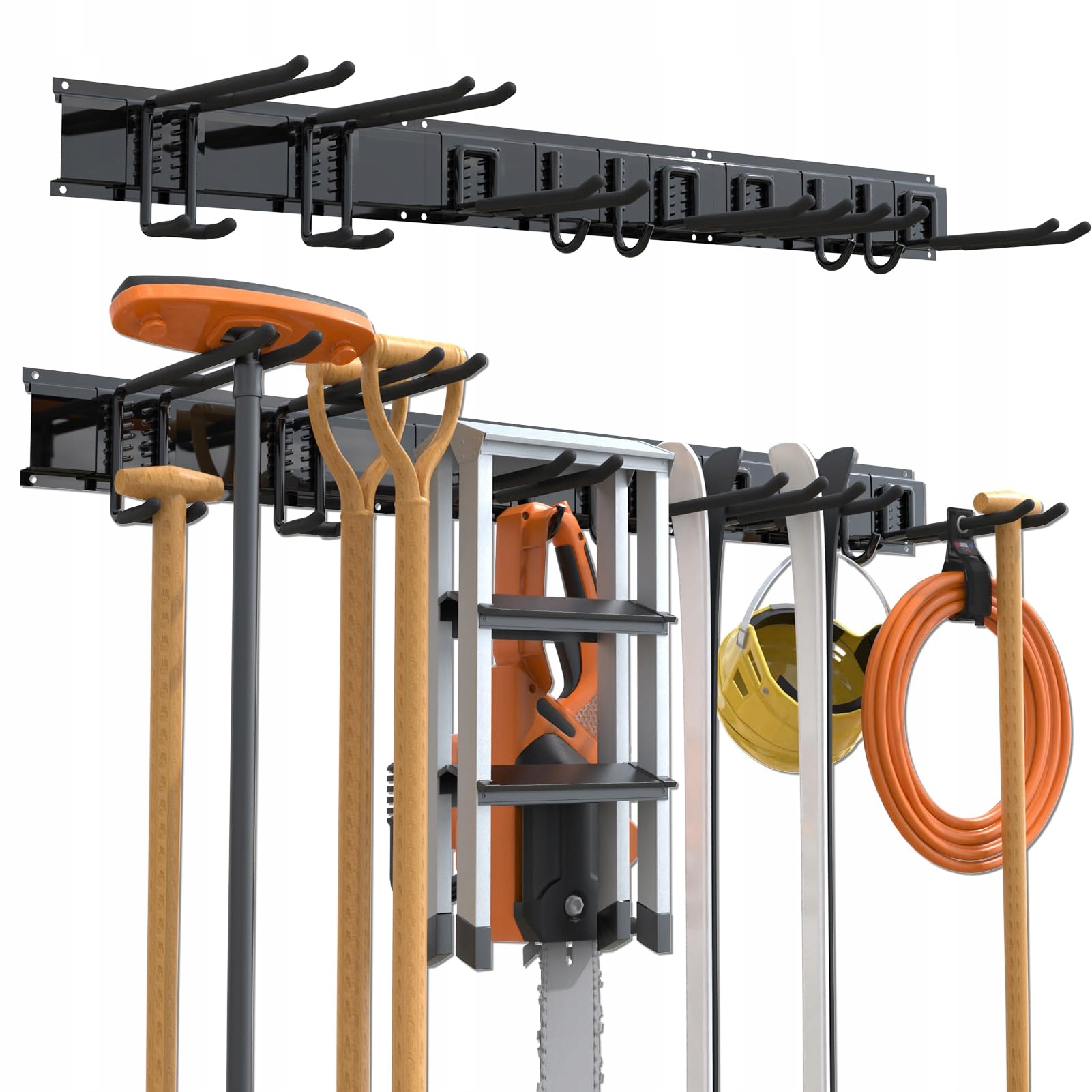 Regulowany design dla uchwytu na narty: W przeciwieństwie do innych spawanych wieszaków na miotły, nasze haki do miotły można przesuwać wzdłuż proszkowanej szyny. Dodatkowo haki do narzędzi ogrodowych są demontowalne i można je dodawać lub usuwać w zależności od potrzeb, co czyni je bardzo łatwymi w użyciu. Idealne do organizacji szop, przestrzeni zewnętrznych i przechowywania w garażu, odporne na warunki atmosferyczne i trwałe