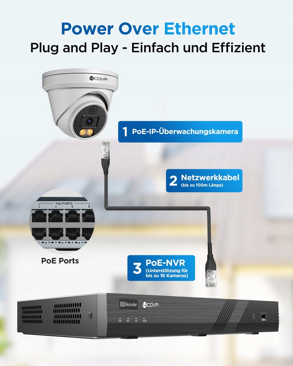 PROSTA INSTALACJA POE – ROZWIĄZANIE PLUG & PLAY: Dzięki technologii PoE potrzebujesz tylko jednego kabla sieciowego na kamerę do zasilania i przesyłania wideo. Instalacja jest łatwa bez skomplikowanego okablowania – wystarczy podłączyć i rozpocząć