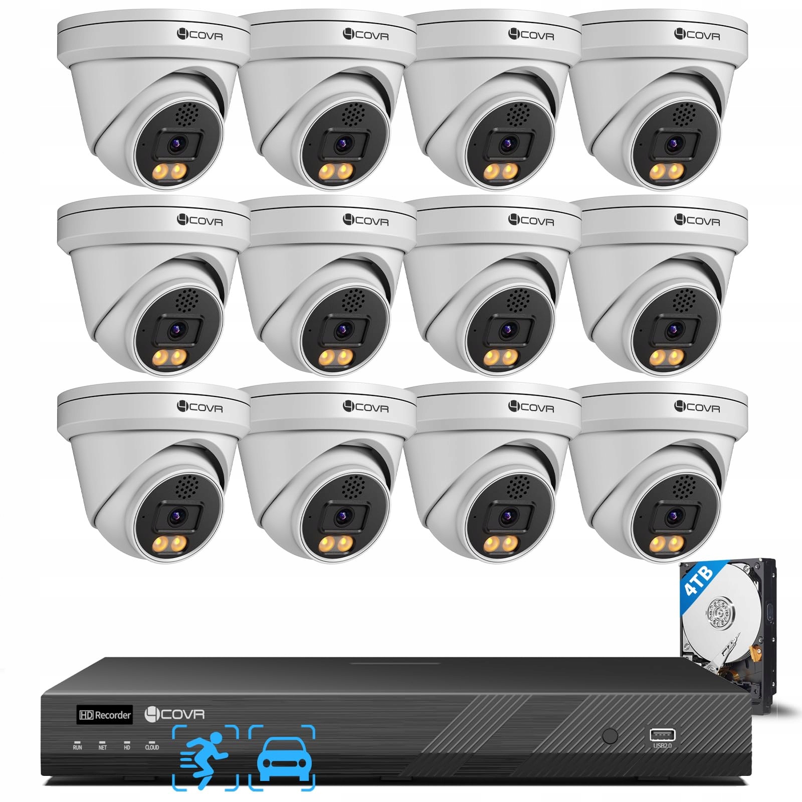 4COVR 16CH PoE Zestaw kamer do monitoringu z dwukierunkowym audio i podwójnym oświetleniem do kolorowego widzenia w nocy, AI wykrywanie osób/pojazdów, 4K NVR z dyskiem 4TB, 12X 5MP kopułkowa kamera zewnętrzna IP67 do zastosowań komercyjnych, DLY97KA5M1612