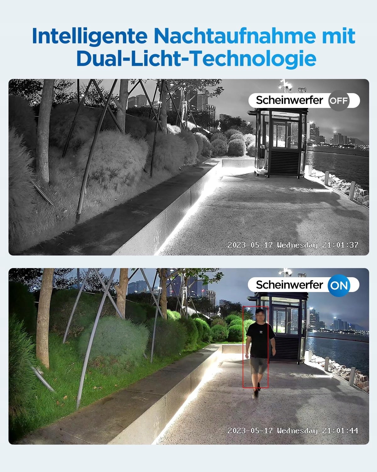 TRZY TRYBY NOCNE: CZARNO-BIAŁY | PEŁNY KOLOR | INTELIGENTNY TRYB DWÓCH ŚWIATEŁ: Domyślnie włączony: inteligentny tryb dwóch świateł. Po wykryciu osób/pojazdów kamera automatycznie przełącza się na kolorowe widzenie nocne dla szczegółowych nagrań. Po opuszczeniu obszaru detekcji wraca do energooszczędnego czarno-białego widzenia nocnego