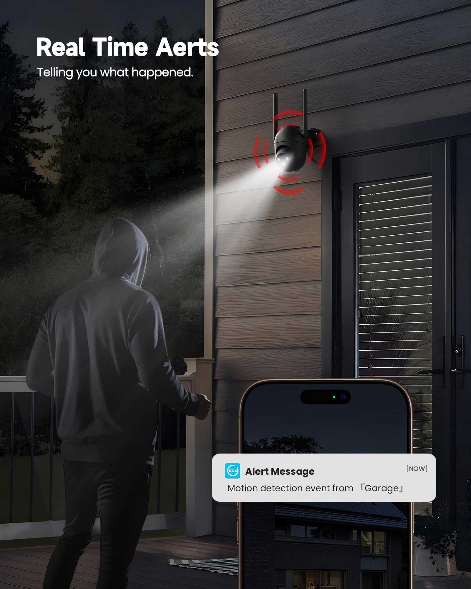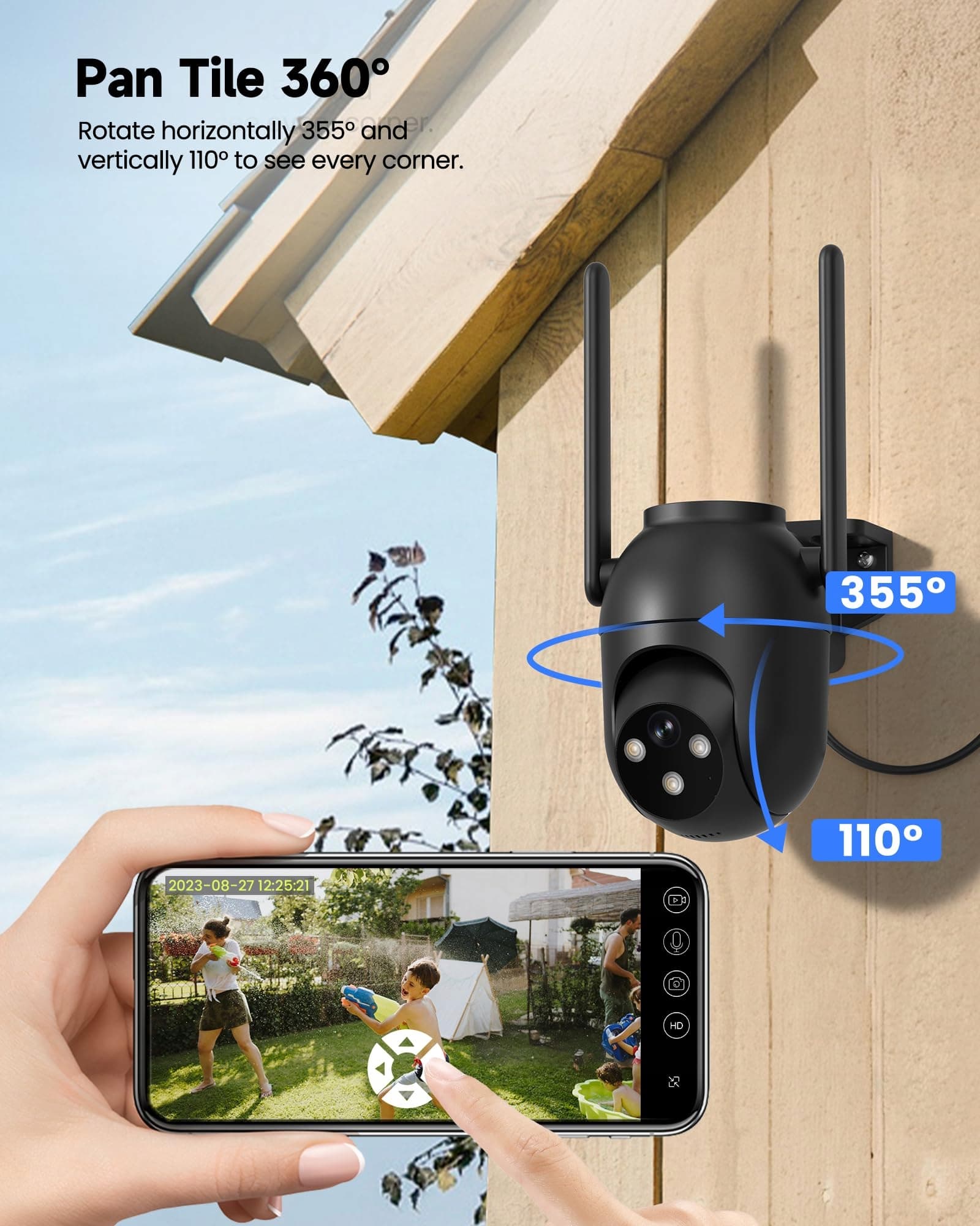 【360° PTZ i inteligentny tryb nocny】: Kamera oferuje pełny widok dookoła, dzięki czemu nie ma martwych punktów – idealna do użytku na zewnątrz. Dzięki 10 metrom inteligentnego podczerwieni i kolorowemu trybowi nocnemu doświadczysz wyraźnych nagrań nawet w ciemności.