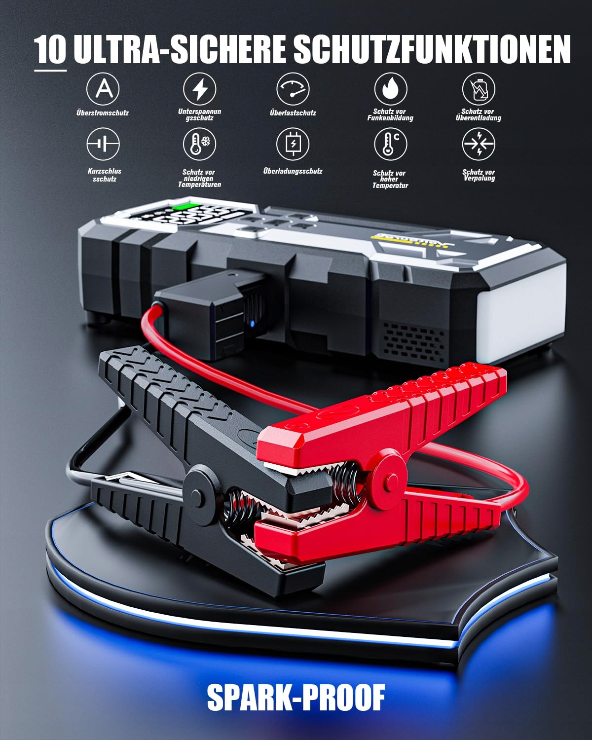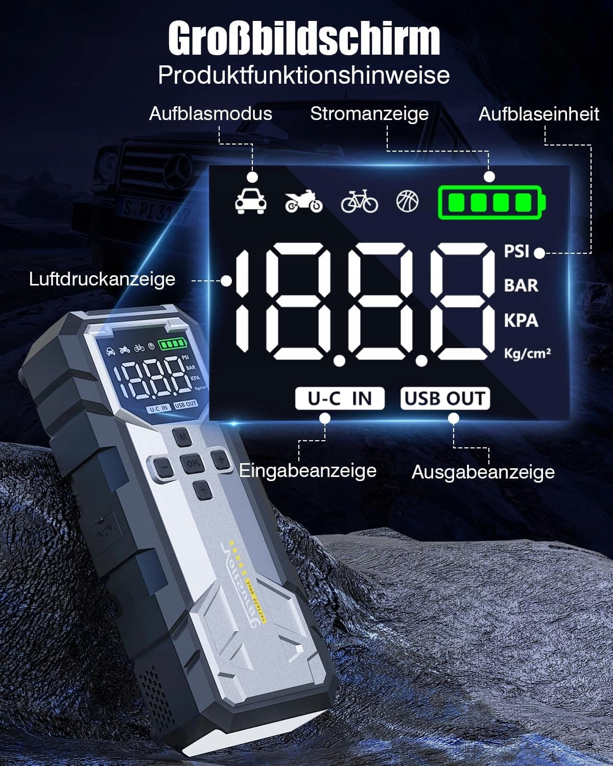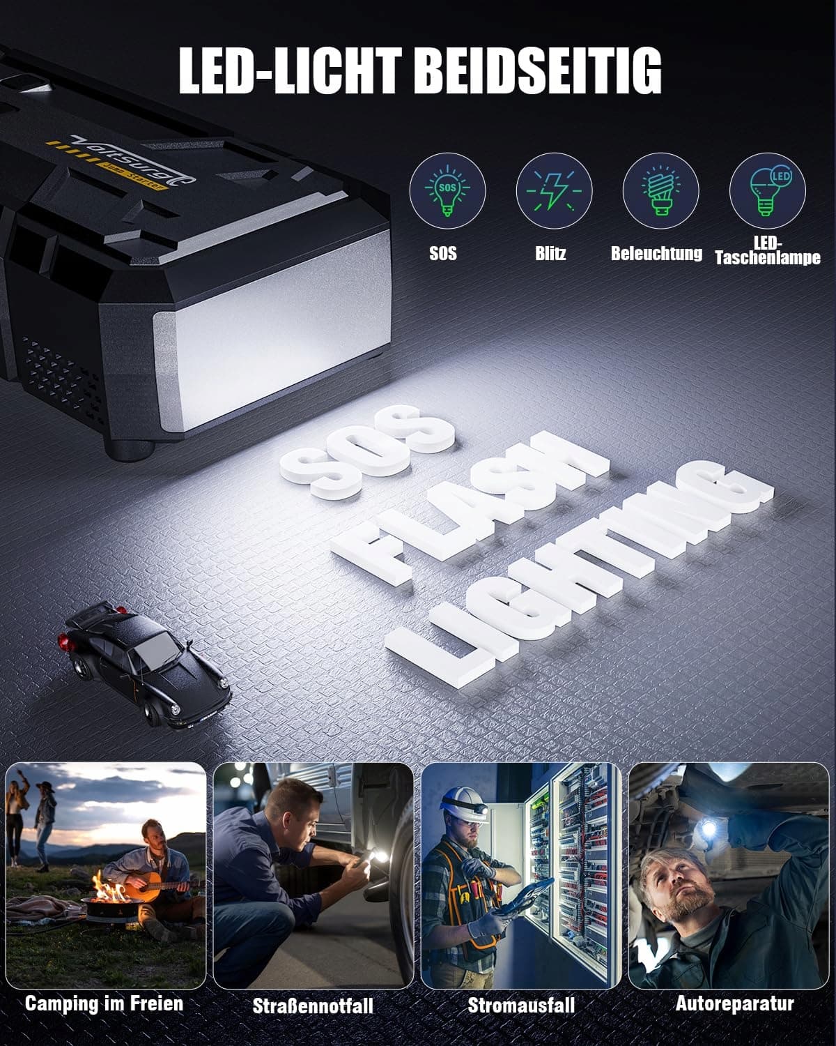 【Wszechstronny design 4-w-1 dla różnych scenariuszy】Jako profesjonalna powerbanka do rozruchu samochodu łączy cztery praktyczne funkcje: rozrusznik samochodowy, kompresor 160PSI, powerbank oraz latarkę LED z trzema trybami (stałe światło, mruganie i SOS). Kompresor umożliwia przełączanie między trzema jednostkami (PSI/BAR/KPA) i obejmuje scenariusze pompowania takie jak samochód, motocykl, rower, piłka do koszykówki i niestandardowe pompowanie; wyświetlacz LCD pokazuje ciśnienie w oponach w czasie rzeczywistym, a latarka LED pomaga w ciemności lub w nagłych wypadkach – umożliwiając łatwe radzenie sobie z różnymi wymaganiami