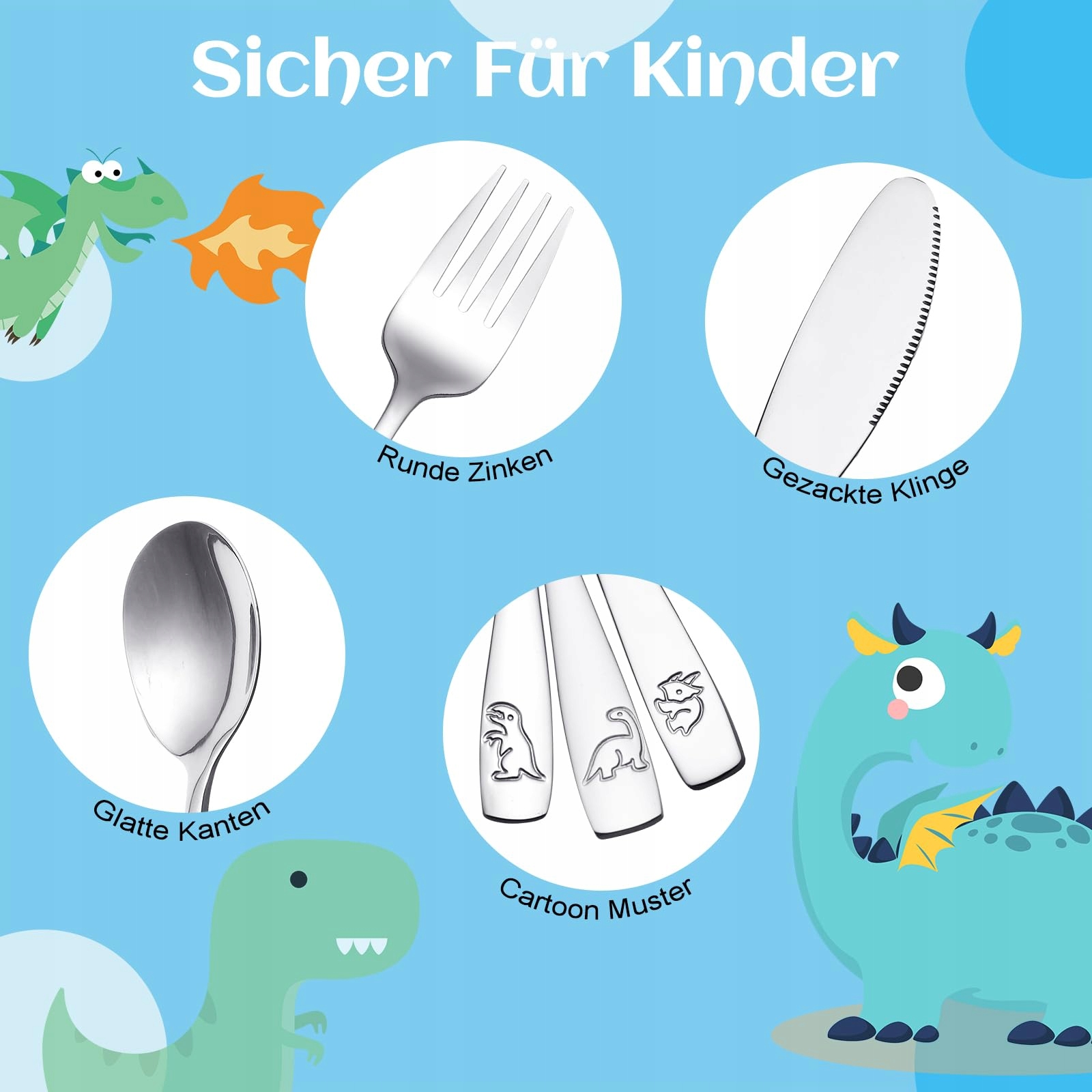 【Bezpieczna konstrukcja】Sztućce dla niemowląt wykonane są z bezpiecznej dla żywności stali nierdzewnej 304, z pasywowaną klingą (17 cm/6,7 cala), gładkimi zębami widelca (15 cm/5,9 cala), gładką krawędzią łyżki (14 cm/5,5 cala) i wszystkie krawędzie są wypolerowane, aby chronić delikatne usta dziecka.