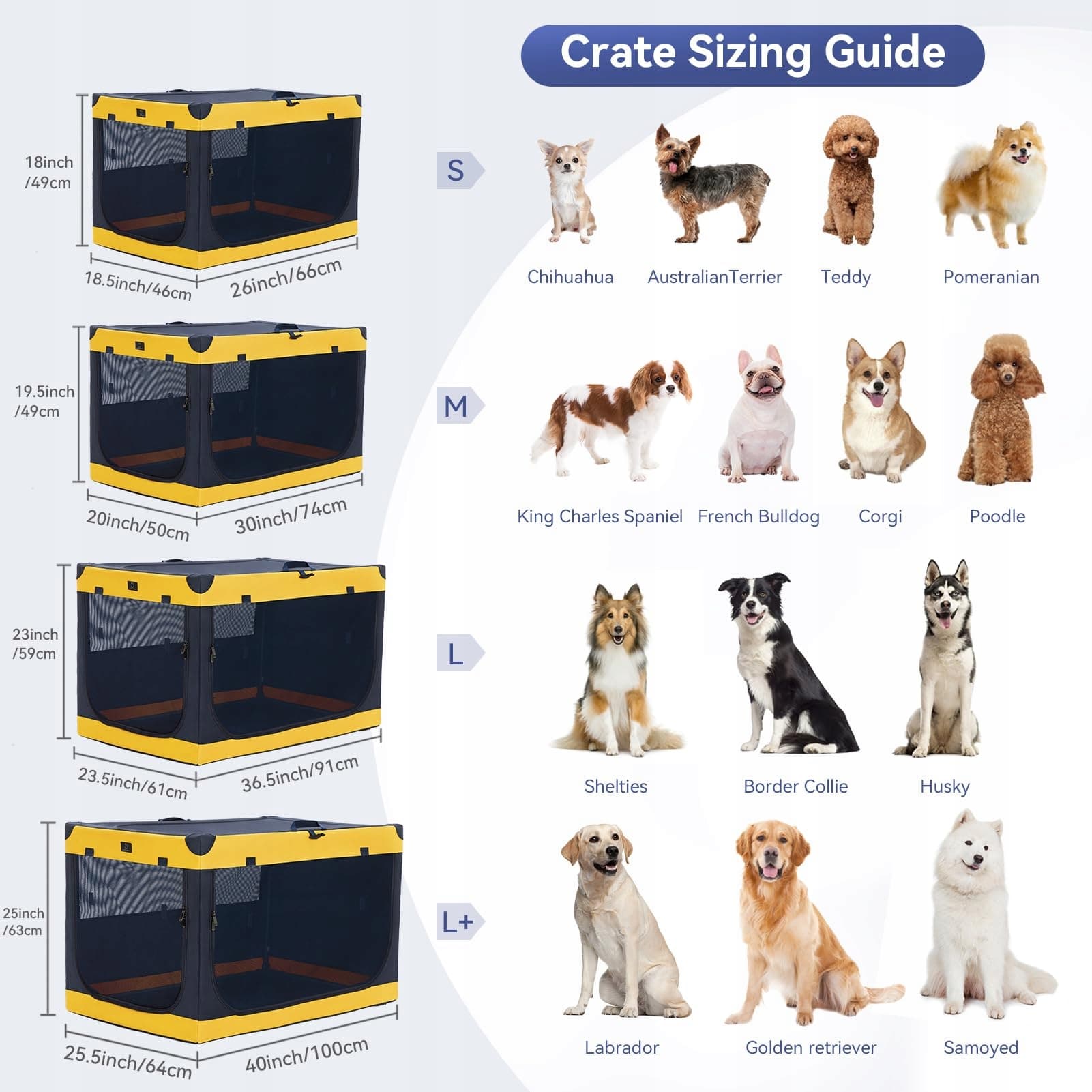 [Skrzynia dla psa dostępna w 4 rozmiarach] Oferujemy 4 rozmiary skrzyni transportowej dla psa. Rozmiar S (48*65*47 cm) dla małych psów, takich jak koty i Teddy, rozmiar M (51*75*49 cm) dla średnich psów, takich jak Corgi, rozmiar L (59*91*59 cm) dla psów, takich jak Labradory, rozmiar XL (66*102*63 cm) dla dużych psów, takich jak Alaski i Owczarki.