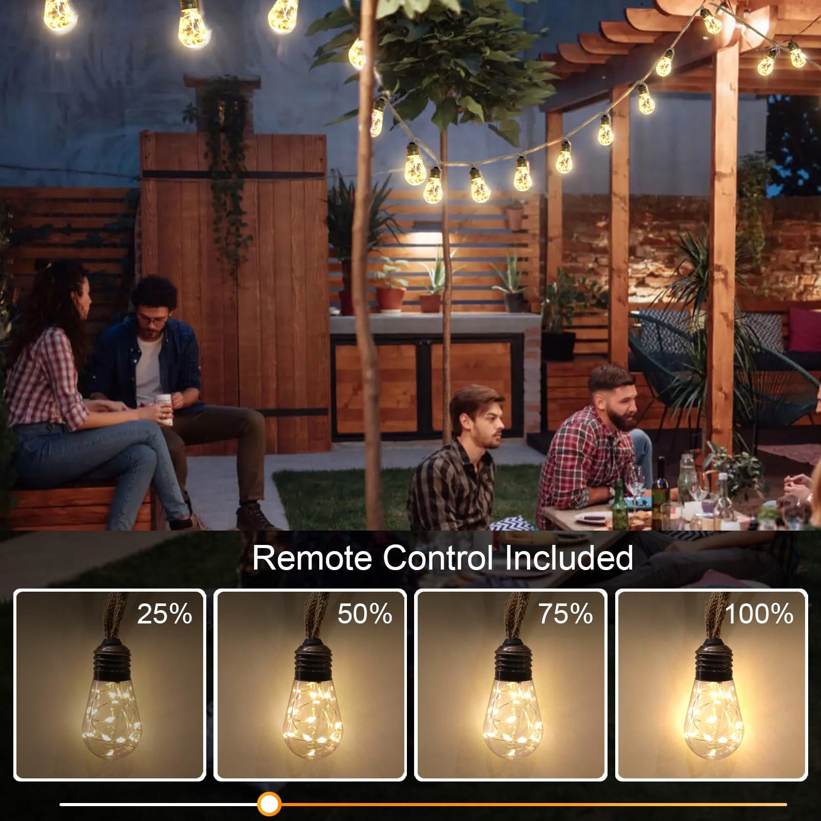 [Lampki z żarówkami z pilotem] Lampki tarasowe do użytku zewnętrznego są wyposażone w piloty, które pozwalają łatwo ustawić jasność, 8 trybów oświetlenia i 3 tryby timera. Możesz włączać i wyłączać lampki oraz łatwiej kontrolować czas.