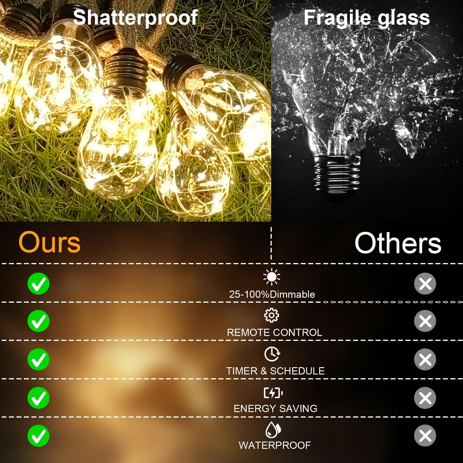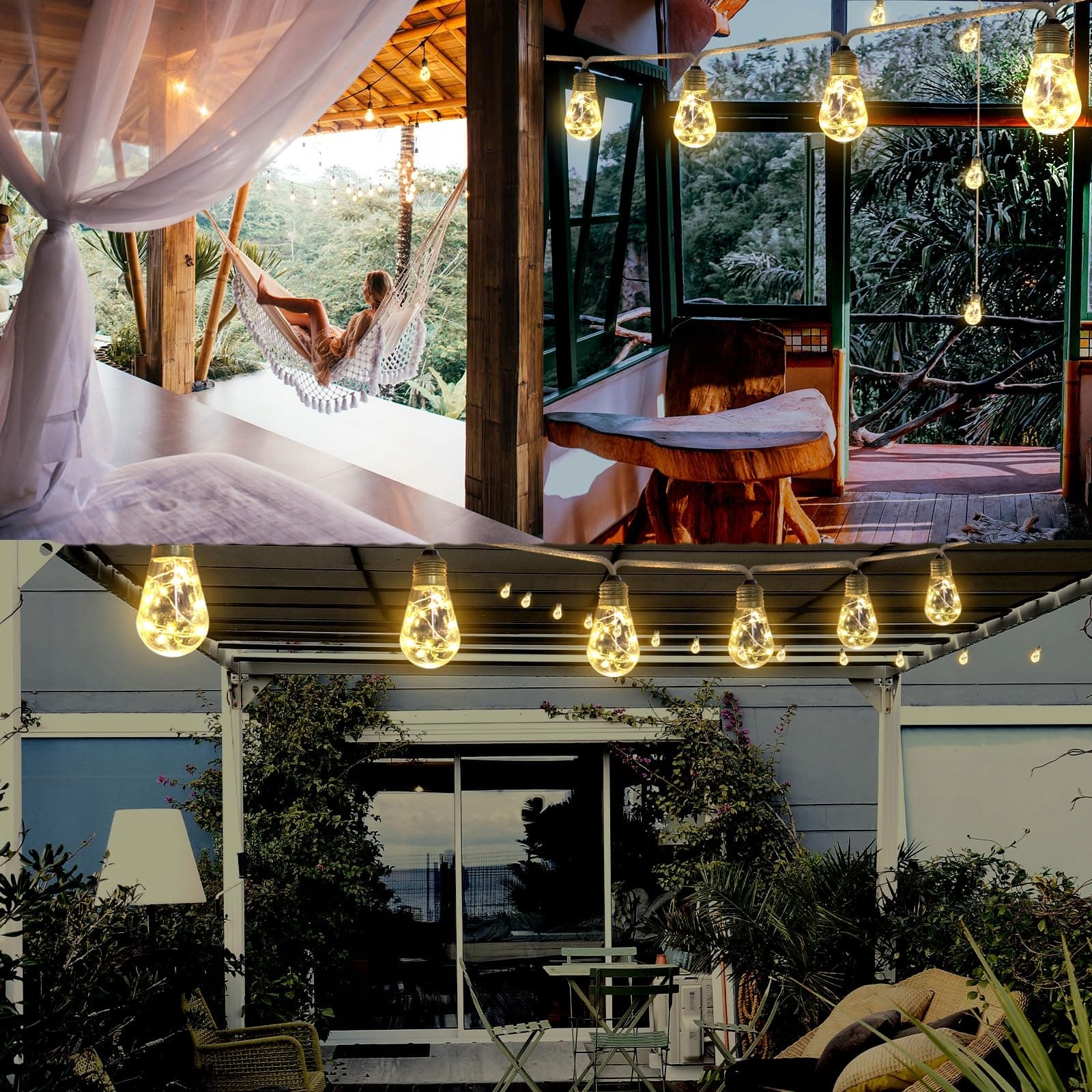 [Odporne na warunki atmosferyczne i trwałe] Lampki zewnętrzne mają ulepszone żarówki z wytrzymałymi plastikowymi osłonami i małymi diodami LED, które są bardziej odporne na stłuczenia i bezpieczniejsze w użyciu oraz wytrzymują złe warunki pogodowe.
