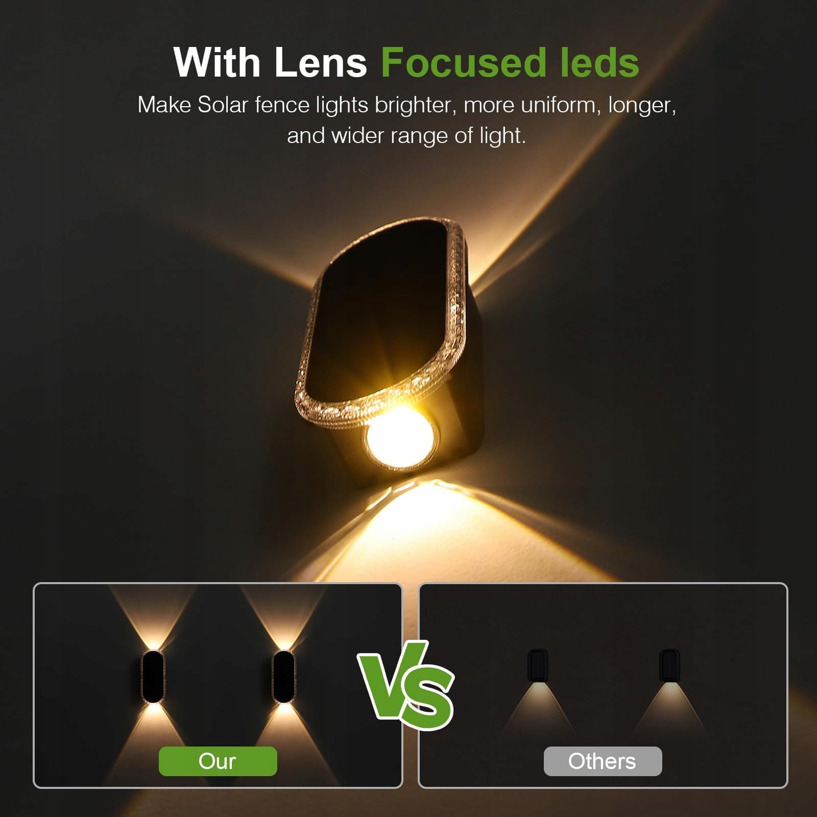 Wszechstronne zastosowanie – Nie musisz się martwić o pogodę. Konstrukcja lampy jest wodoodporna. Ta solarna lampa na płot została zaprojektowana z materiałów odpornych na warunki atmosferyczne i posiada klasę wodoodporności, dzięki czemu wytrzymuje różne warunki zewnętrzne. Wodoodporna lampa solarna na zewnątrz nadaje się do drewnianych płotów, tarasów, werand, podwórek, bram garażowych, ogrodów, willi, schodów, płotów, przejść, schodów itp.