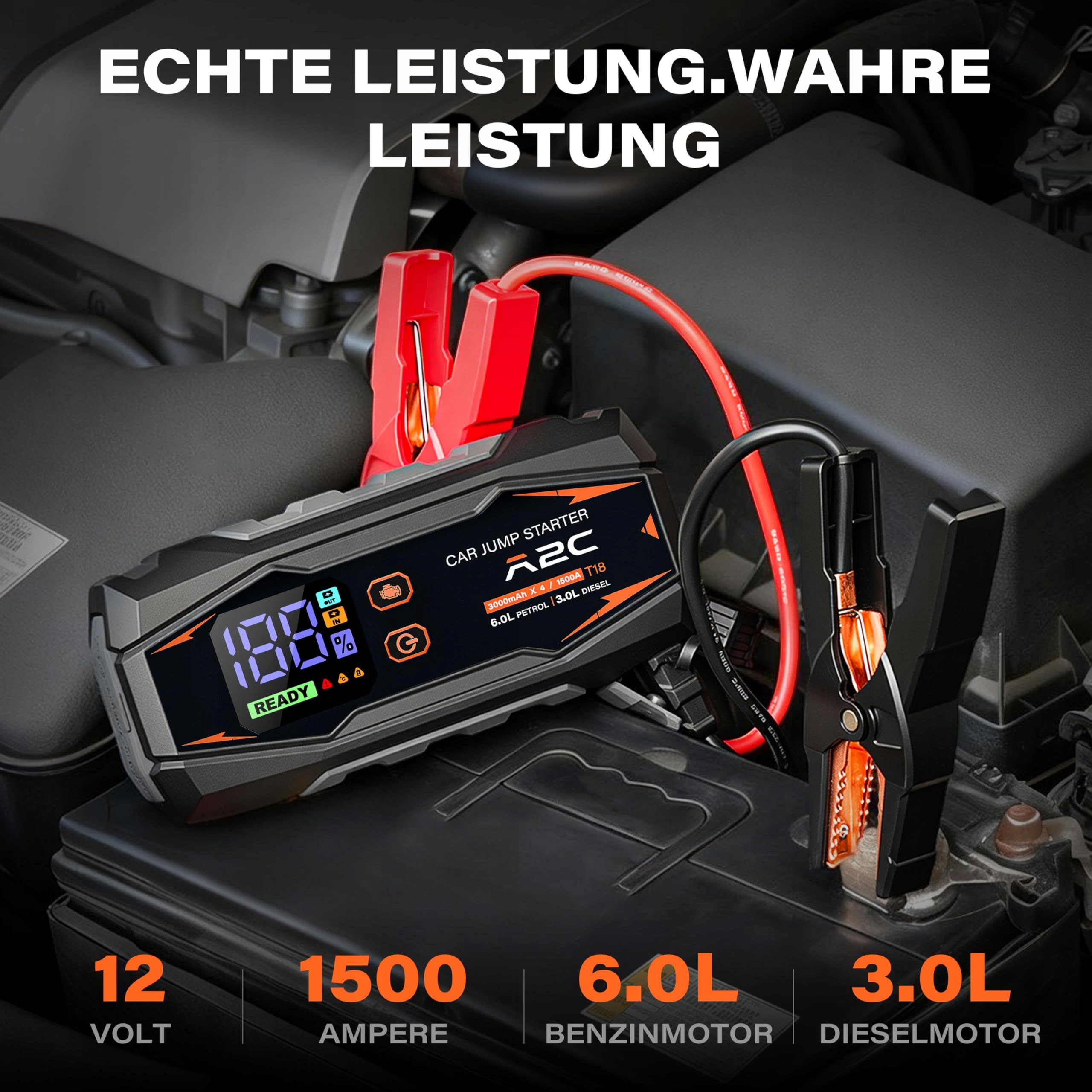 【Mocna pomoc przy rozruchu】 A2C powerbank do rozruchu zapewnia ogromny prąd szczytowy 1500 A, umożliwiając szybkie uruchomienie rozładowanych akumulatorów samochodowych nawet w ekstremalnych temperaturach od -20 °C do 55 °C. Kompatybilny z silnikami benzynowymi do 6,0 l i silnikami Diesla do 3,0 l (samochody osobowe, SUVy, ciężarówki, vany, motocykle itp.)