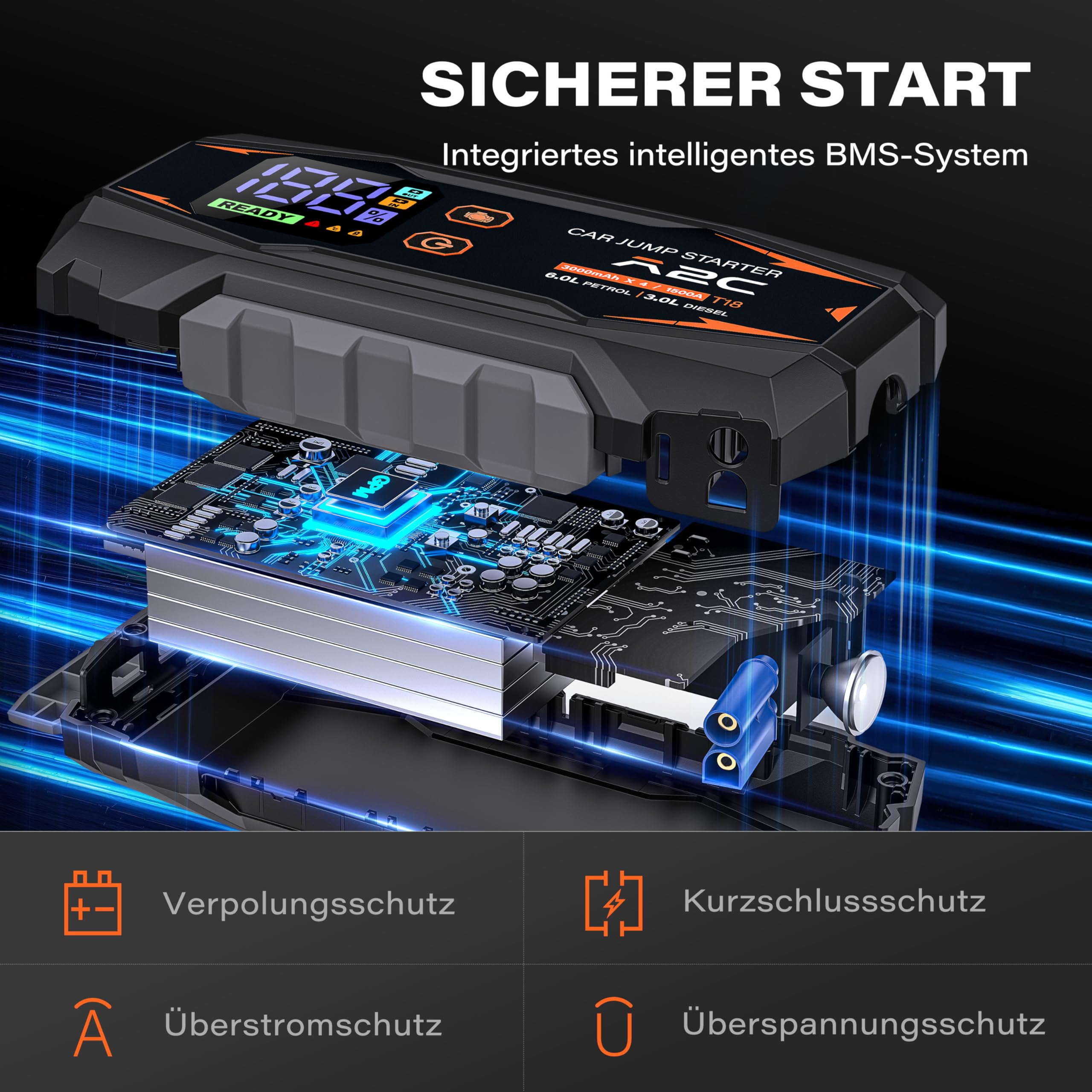【Bezpieczeństwo i ochrona】 A2C powerbank do rozruchu wyposażony jest w zaawansowane technologie bezpieczeństwa, w tym ochronę przed odwrotną polaryzacją, ochronę przed przeciążeniem, ochronę przed przepięciami, ochronę przed przeładowaniem, ochronę przed zwarciem, ochronę przed głębokim rozładowaniem, ochronę termiczną i ochronę przed iskrzeniem