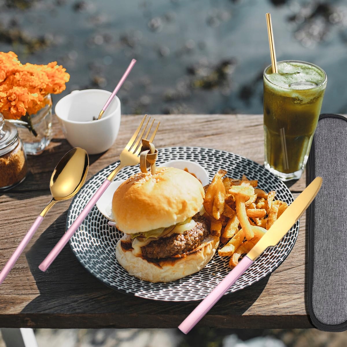 【6-częściowe sztućce z etui】6-częściowy zestaw sztućców ze stali nierdzewnej, zestaw dla 1 osoby, składa się z 1 noża do jedzenia, 1 łyżki do jedzenia, 1 widelca do jedzenia, 1 łyżeczki do herbaty, 1 słomki i 1 szczotki do słomki, zapakowany w wodoodporną torbę transportową.