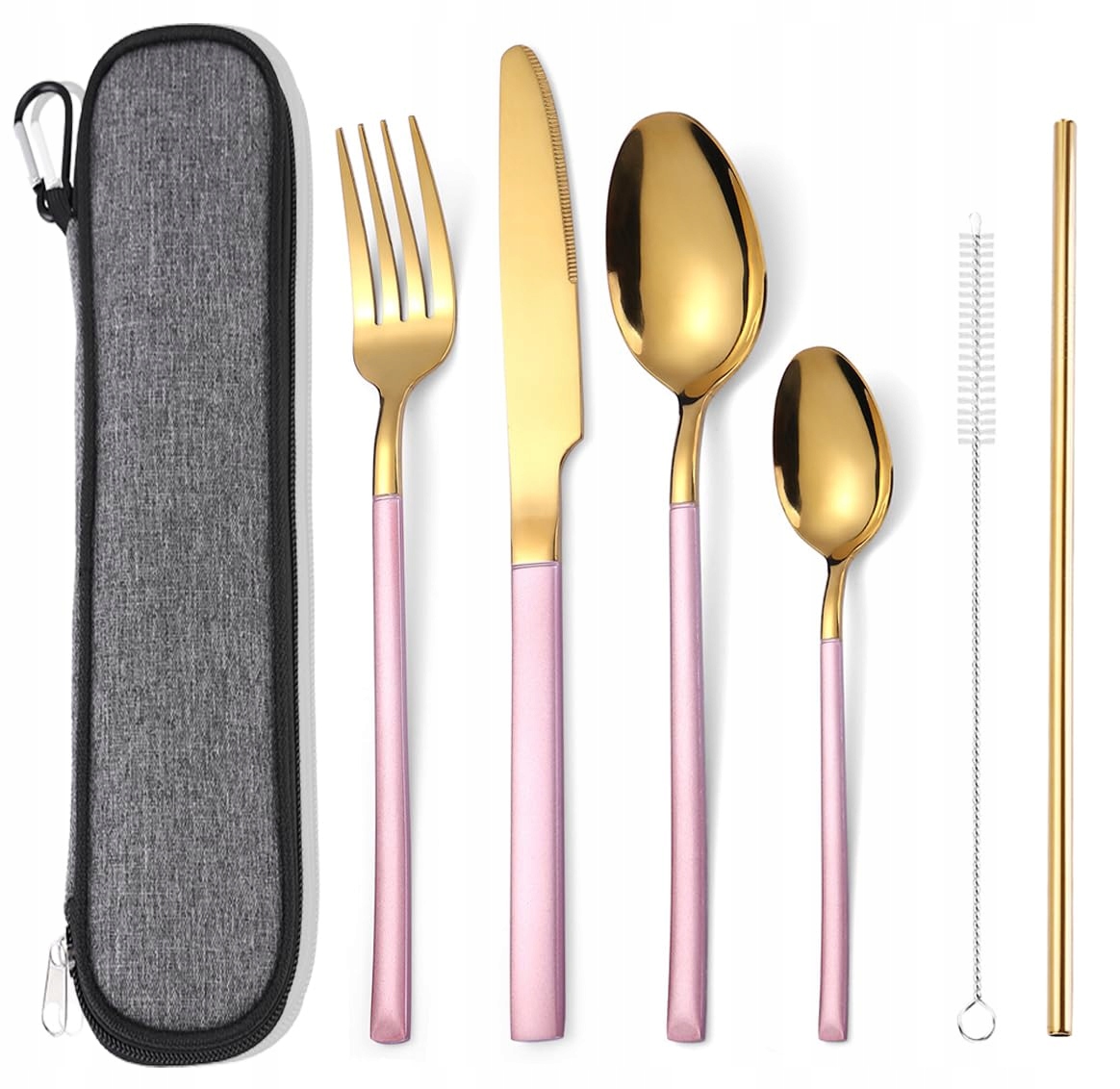 AARAINBOW Przenośny zestaw sztućców dla 1 osoby, zestaw noża, widelca i łyżki ze stali nierdzewnej. 6-częściowy zestaw sztućców z etui, na podróż, kemping, do pracy, bezpieczny do zmywarki, różowe złoto