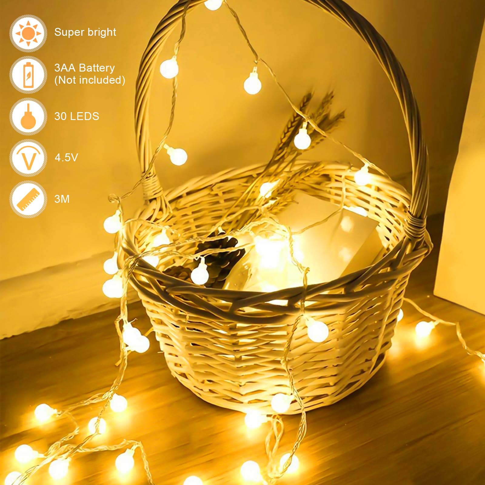Wysokiej jakości łańcuch świetlny LED – Wykonany z wysokiej jakości materiału, nie odkształca się łatwo i nigdy nie nagrzewa się na tyle, aby powodować obawy. 3-metrowy/10-stopowy łańcuch świetlny z 30 małymi kulkami, przewód zasilający ma długość 50 cm, a średnica każdej kulki wynosi około 1,7 cm.