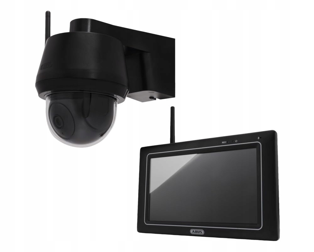Zestaw bezprzewodowy z przenośnym monitorem z dostępem do pamięci, ekranem dotykowym i sterowaną przez niego kamerą monitoringu; duży zasięg, wykrywanie osób, tryb alarmu i nagrywania, funkcja interkomu, nocny tryb widzenia, maskowanie stref prywatnych i wiele więcej