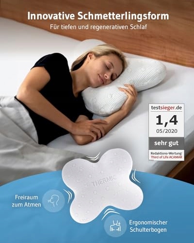 ➥ DLA ŚPIĄCYCH NA BOKU I W POZYCJI PÓŁLEŻĄCEJ – Ergonomiczna poduszka w kształcie motyla idealnie nadaje się dla wszystkich, którzy lubią spać na boku lub w półleżącej pozycji na brzuchu (zdjęcie 2). Pianka doskonale dopasowuje się do naturalnej pozycji snu, a boczne wycięcia w kształcie motyla tworzą wolną przestrzeń do oddychania, co jest również idealne do noszenia masek CPAP do snu.