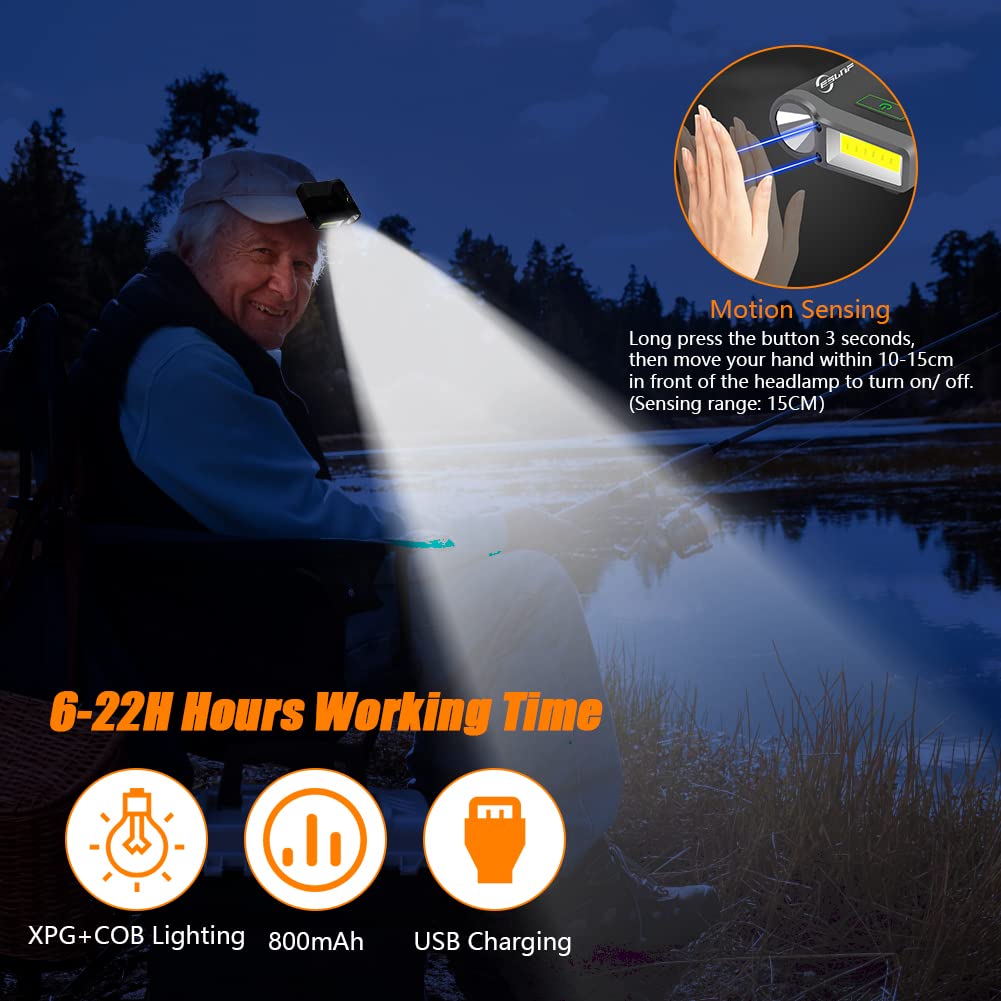 Acemall Wodoodporna LED Clip On Czapka Lekka, Wielokrotnego ładowania Czołówka z czujnikiem, Lekka latarka na głowę do wędkowania, biegania, biwakowania, czytania, wyprowadzania psa, rękodzieła