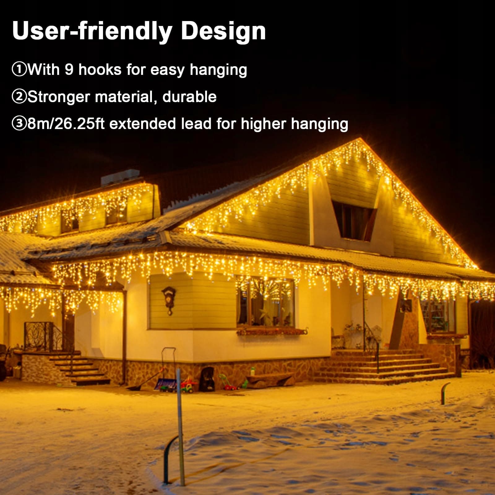 Idealna dekoracja do wnętrz i na zewnątrz: Wodoodporne światła sopli są idealne do użytku wewnątrz i na zewnątrz, na Boże Narodzenie, imprezy, wesela, dachy, salony, domy, okna, uroczystości, święta itd. Ta girlanda z soplami lodu upiększy twoje życie. Proszę pamiętać, że wtyczka musi być chroniona przed wodą.