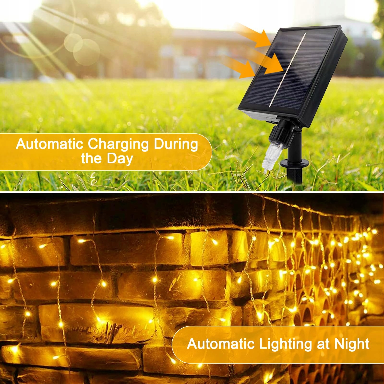 [Zasilane Słonecznie]: Ta lampa LED jest ładowana energią słoneczną, co jest przyjazne dla środowiska i nie marnuje energii elektrycznej. Ta zewnętrzna kurtyna świetlna ma wbudowaną baterię o pojemności 1200 mAh. Może być w pełni naładowana w ciągu około 6 godzin przy bezpośrednim nasłonecznieniu w ciągu dnia i może świecić przez 6 do 18 godzin przy pełnym naładowaniu.