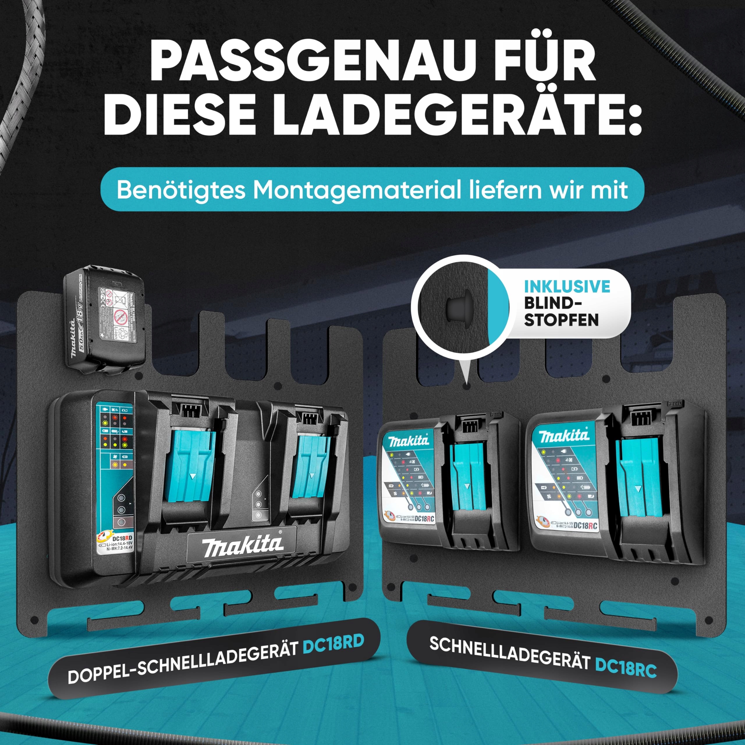 WSZYSTKIE ŁADOWARKI - Można je zamontować na uchwycie ściennym Makita zarówno dla ładowania pojedynczego, jak i podwójnego (Markita DC18RC & DC18RD)