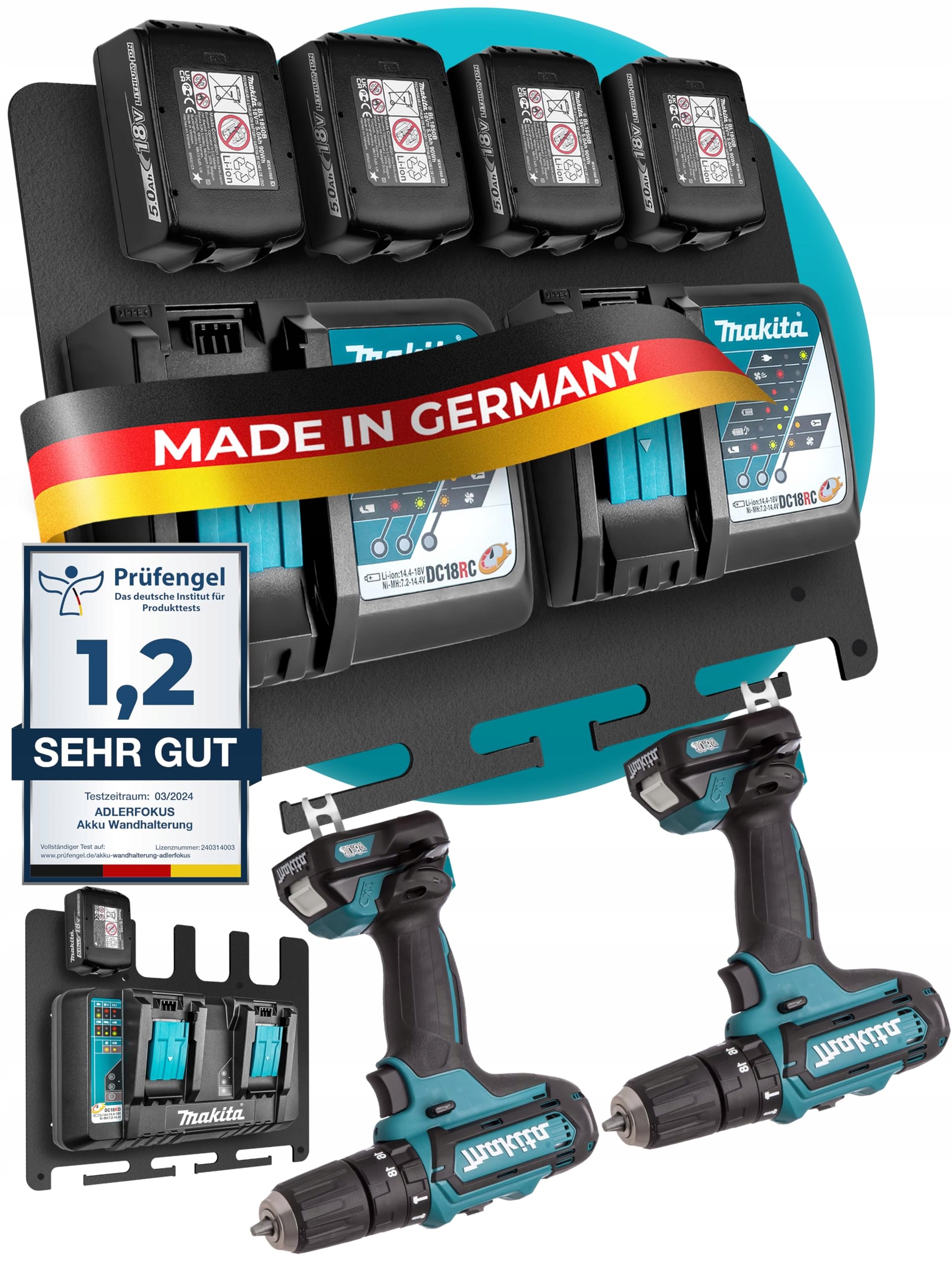 Uchwyt ścienny Adlerfokus dla akumulatorów i ładowarek Makita [Wyprodukowano w Niemczech] Uchwyt akumulatora Makita z materiałami montażowymi premium - Uchwyt ścienny Makita dla ładowarki - Uchwyt akumulatora na ścianę dla porządku i systemu