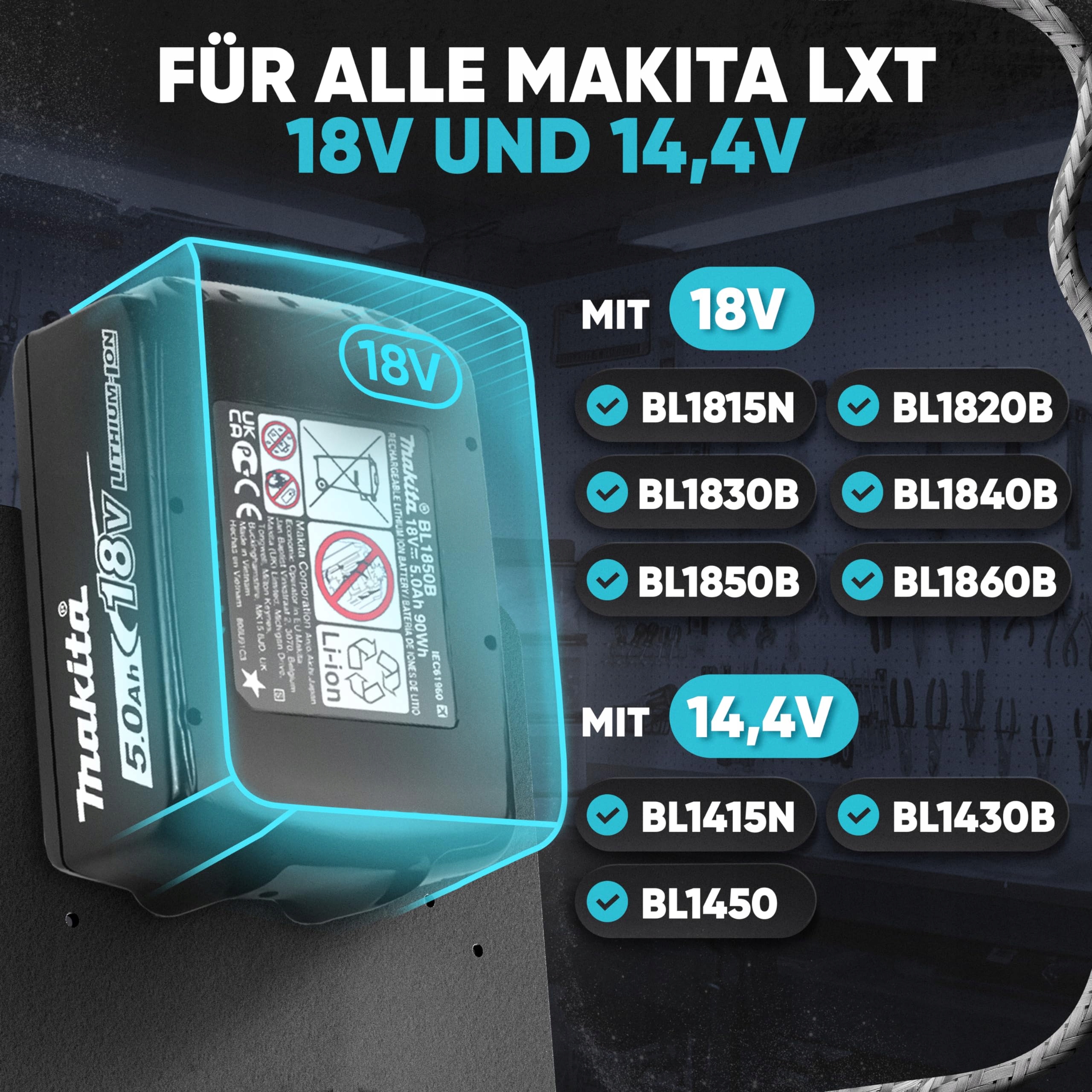 AKUMULATORY 18V & 14V - Uchwyt akumulatora idealnie pasuje do wszystkich urządzeń akumulatorowych Makita. Dzięki uchwytowi na baterię uchwyt akumulatora Makita 18V & 14,4V zawsze jest pod ręką
