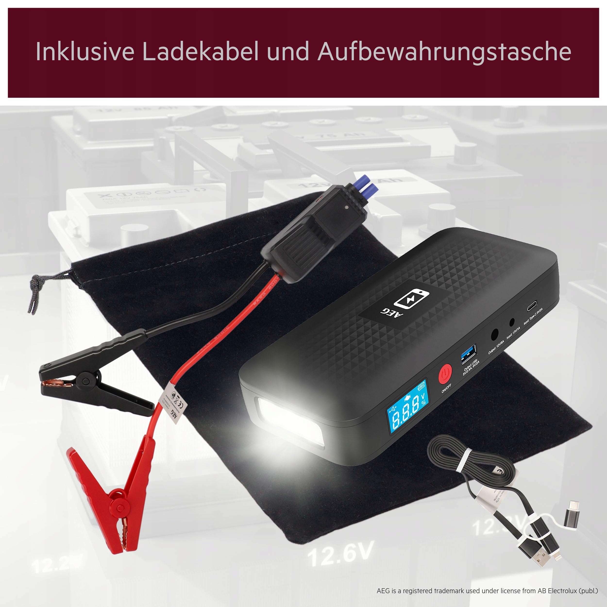 MULTIFUNKCYJNY: Pomoc do rozruchu AEG jest jednocześnie mobilną stacją energetyczną, która ładuje smartfony, kamery i inne urządzenia. Mini jumpstarter od AEG jest niewiele większy niż normalna powerbanka. Waży 534 g i ma wymiary 190 x 85 x 28,5 mm (D x S x W)