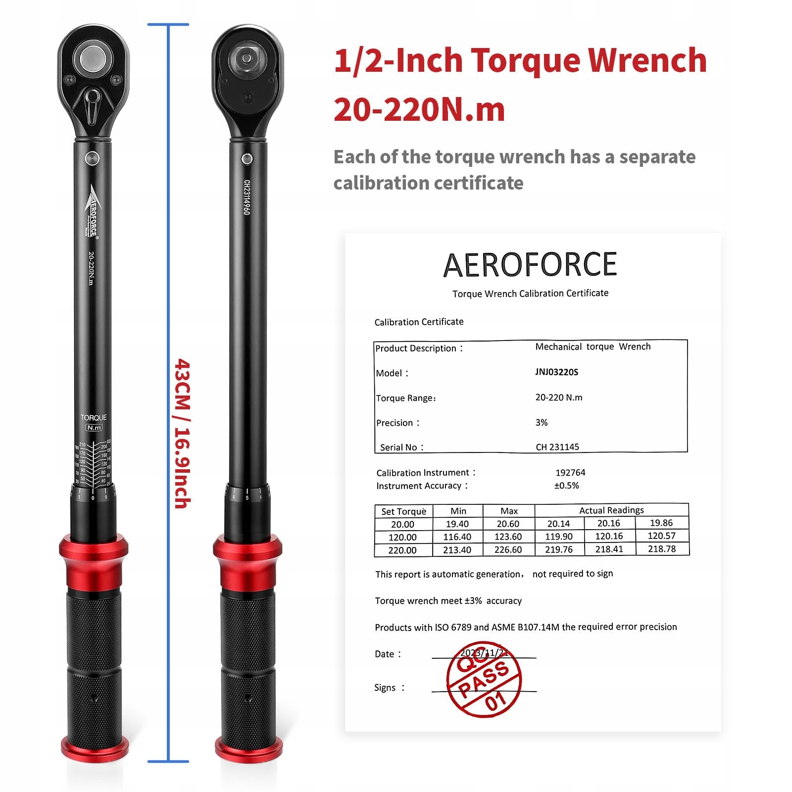 【Najwyższa precyzja】 Klucz dynamometryczny 1/2 cala jest wyposażony w precyzyjnie skalibrowane komponenty - zakres momentu obrotowego od 20 do 220 Nm z dokładnością +/-3%. Każdy z przemysłowych kluczy dynamometrycznych został w pełni skalibrowany i przetestowany zgodnie z normami DIN ISO 6789, ISO 6789 i ASME B107.14M i jest dostarczany z osobnym certyfikatem kalibracji.