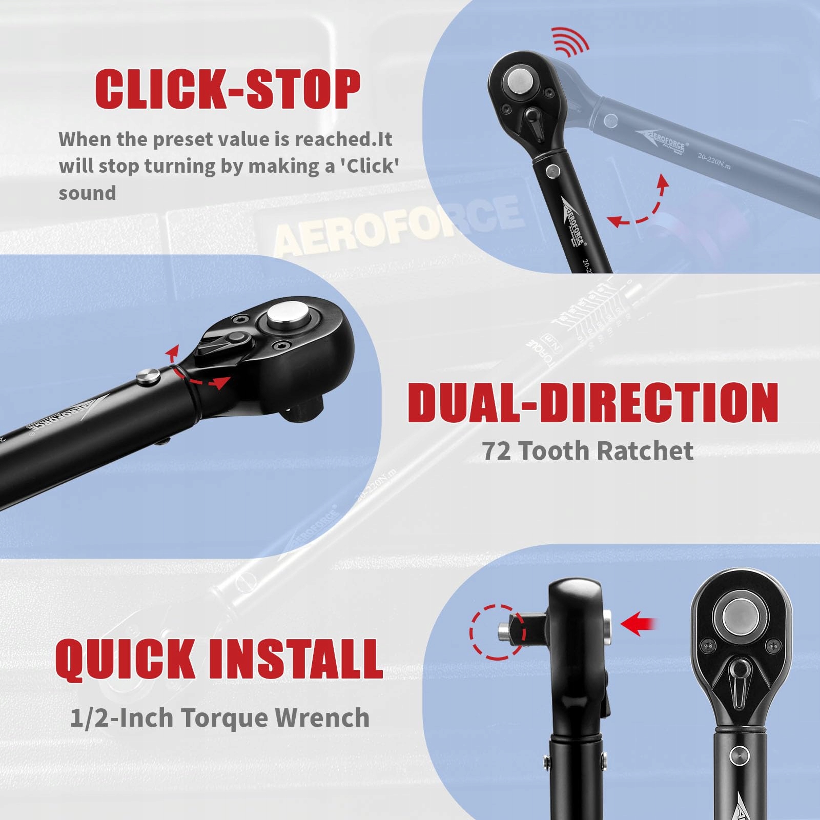 AEROFORCE klucz dynamometryczny 1/2 cala, ± 3% dokładności błędu, 20-220 Nm klucz dynamometryczny 72-zębowy do motocykli, naprawy samochodów