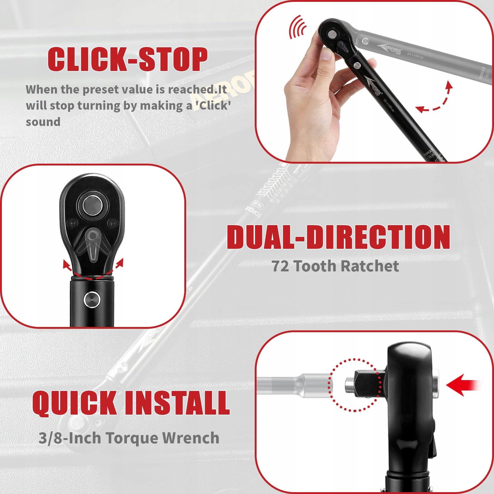 【Zawiera】 Zestaw zawiera klucz dynamometryczny 3/8 cala. Odpowiedni do uniwersalnego użytku w różnych środowiskach pracy, idealny do wymiany świec zapłonowych w samochodach.