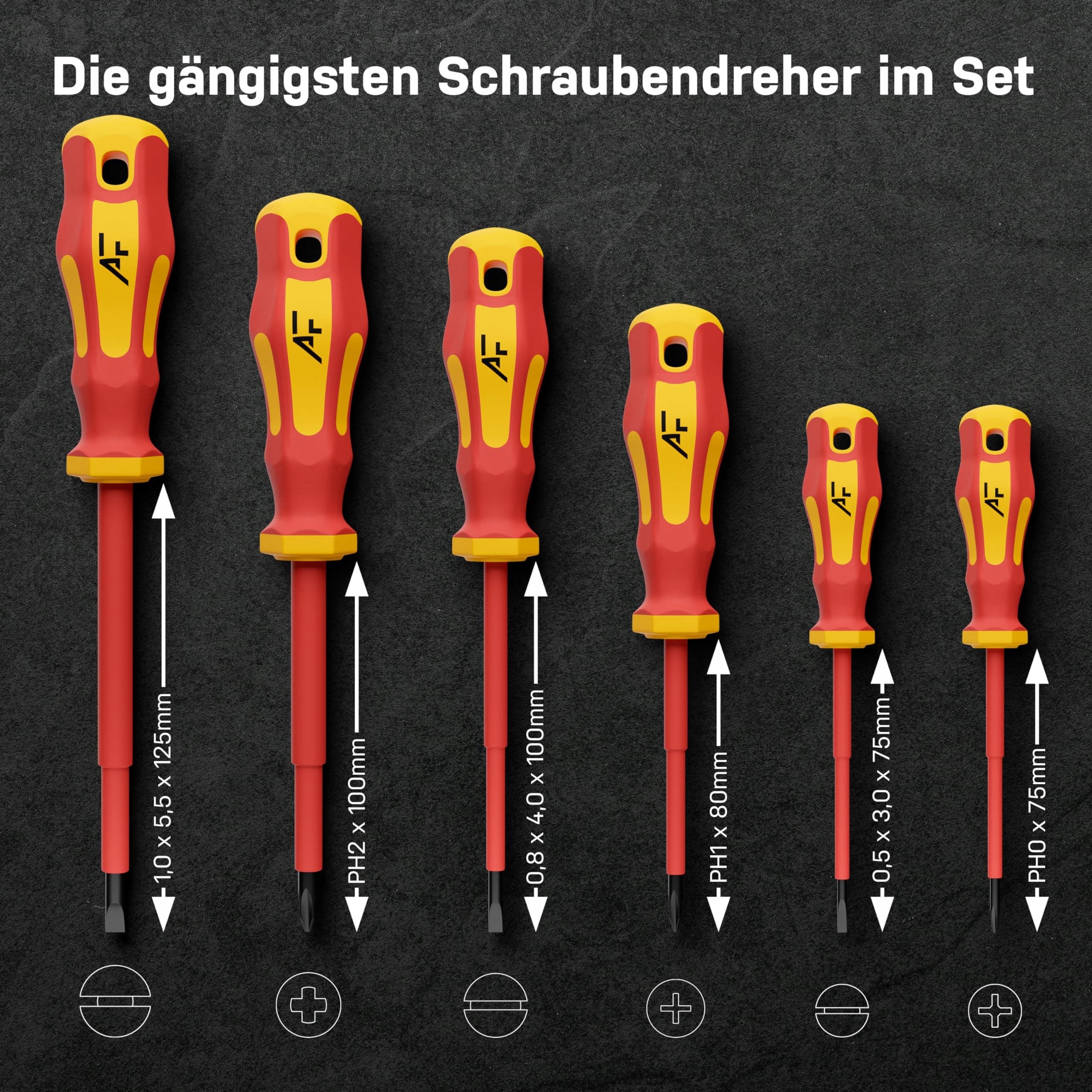 Perfekcyjnie dobrany zestaw: 3x wkrętaki płaskie (0,5 x 3,0 x 75mm / 0,8 x 4,0 x 100mm / 1,0 x 5,5 x 125mm) oraz 3x wkrętaki krzyżowe (PH0 x 75mm / PH1 x 80mm / PH2 x 100mm) pokrywają najczęstsze potrzeby.