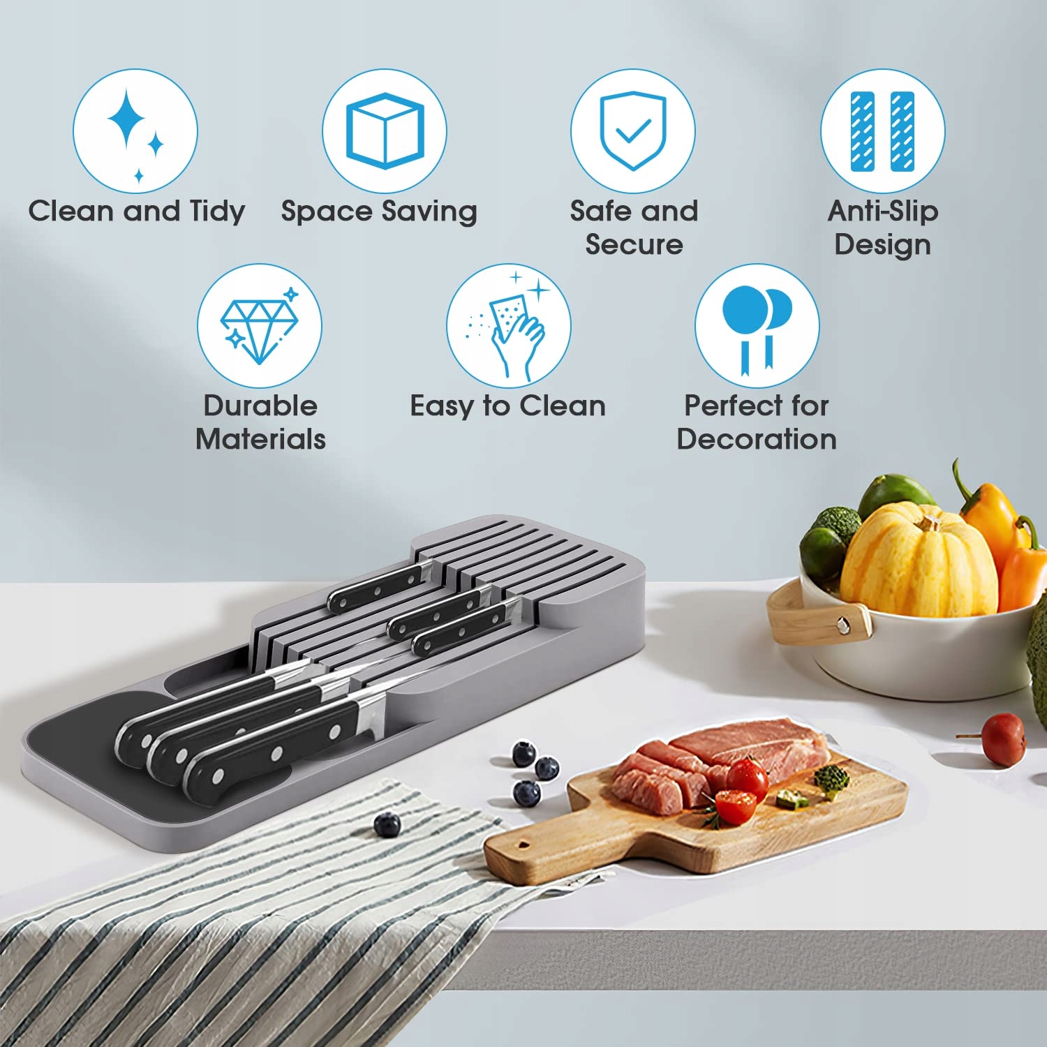 Ulepszony blok na noże do szuflady, dwupoziomowy organizer na noże z przegródkami, miejsce na 9 noży, blok na noże z antypoślizgową podkładką, do szuflad lub na blat, bezpieczny, kompaktowy - szary