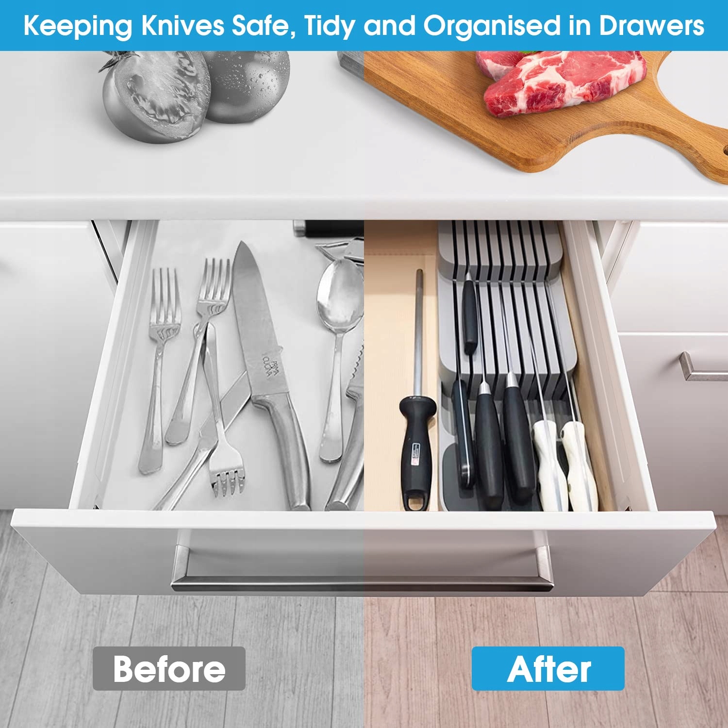 ❤️️【Bezpieczne przechowywanie】: Luzem przechowywane ostre noże w szufladach mogą być niebezpieczne i mogą uszkodzić drogie ostrza. Uchwyt na noże ma wąskie rowki zapewniające dobrą separację i utrzymanie noża. Organizer umożliwia bezpieczne przechowywanie i skutecznie zapobiega przypadkowym skaleczeniom podczas przeszukiwania szuflady. Dzięki pionowemu przechowywaniu ostrza są chronione przed uszkodzeniem.