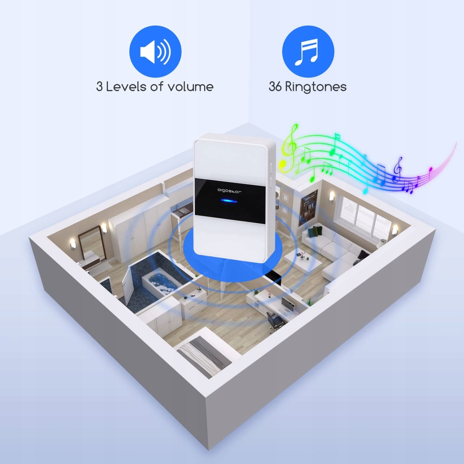 Różne dźwięki i głośność: Możesz wybierać spośród 36 melodii i 3 regulowanych poziomów głośności i dostosować je według własnych potrzeb.