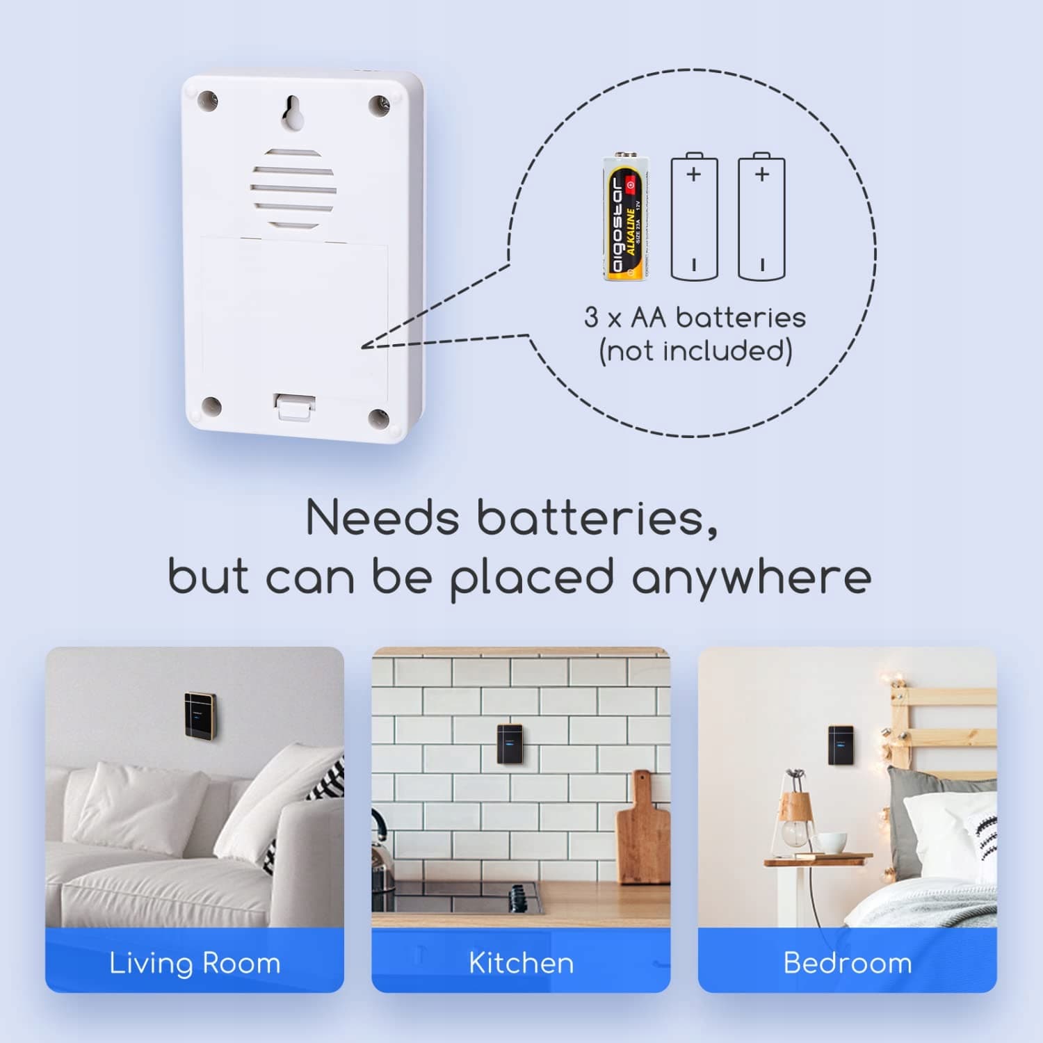 Łatwy w instalacji: Przycisk można przymocować do futryny za pomocą taśmy klejącej. Niebieska dioda LED miga, gdy ktoś naciśnie przełącznik.
