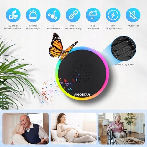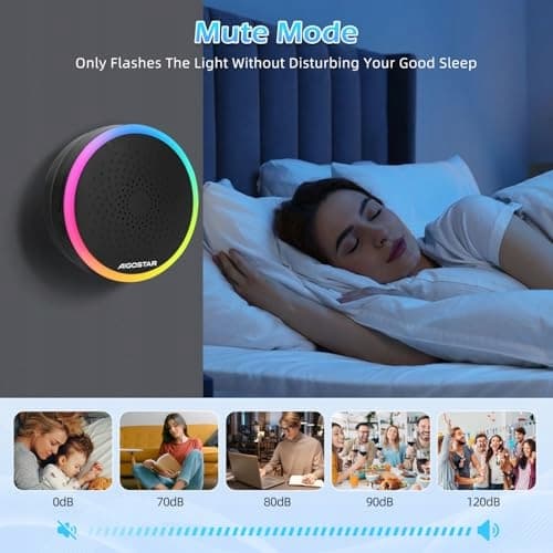 RGB wskaźnik świetlny dzwonka bezprzewodowego: Gdy nadajnik jest naciśnięty i sygnał jest odbierany, RGB wskaźnik świetlny na zasilanym bateriami odbiorniku miga. Poziom ciśnienia akustycznego 120 decybeli ostrzega osoby z uszkodzeniem słuchu lub starsze osoby. Jeśli dźwięk dzwonka nie jest potrzebny, możesz wyciszyć przycisk z przodu, a RGB światło poinformuje Cię wizualnie.