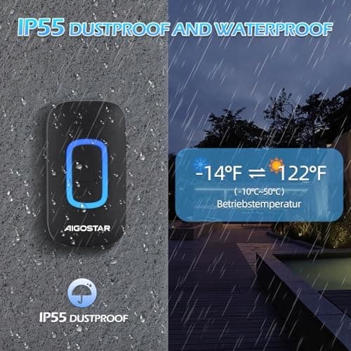 IP55 wodoodporny i pyłoszczelny: Nasz dzwonek bezprzewodowy jest odporny na kurz i wodę oraz wytrzymuje temperatury od -10°C do 50°C. Zasilany bateriami dzwonek do drzwi jest wodoodporny zgodnie z IP55 i odporny na ekstremalne warunki.