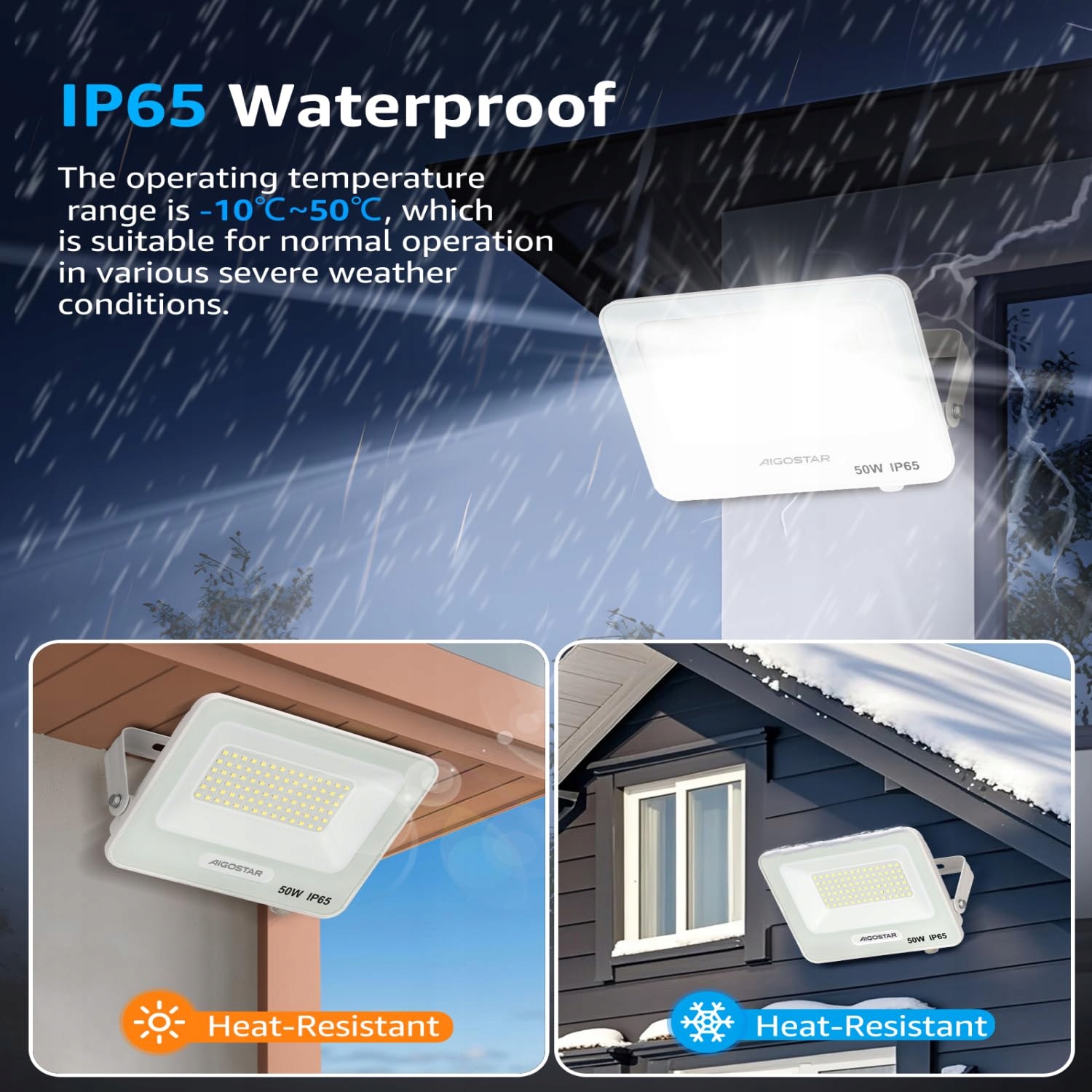 IP65 wodoodporny i pyłoszczelny: Wodoodporność reflektora LED do użytku zewnętrznego wynosi IP65, odpowiednia do warunków zewnętrznych. Niezależnie od deszczu, śniegu, światła słonecznego, wiatru, ciepła czy zimna, zapewnia normalne działanie reflektora