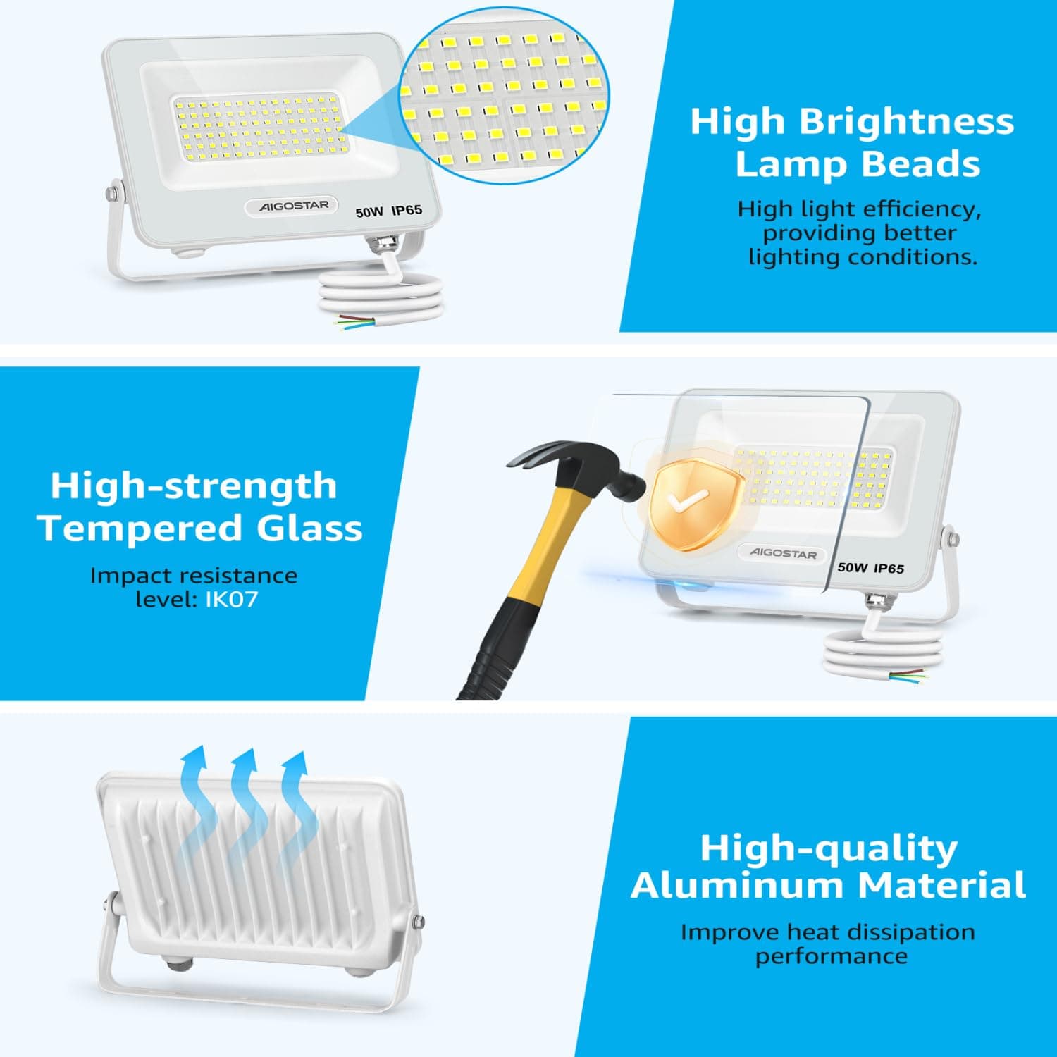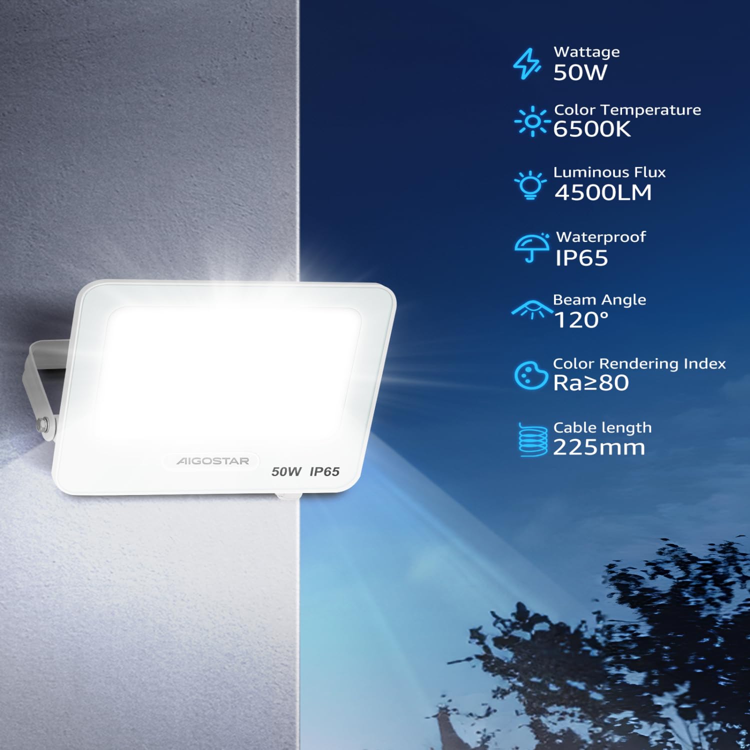 Super jasny i energooszczędny: Aigostar LED reflektor zewnętrzny wykorzystuje wysokiej jakości chipy LED: wysokie światło, wysoka wydajność świetlna, długa żywotność. Może zastąpić tradycyjną żarówkę. Reflektor LED 50W o mocy światła 4500 lumenów może zaoszczędzić ponad 85% energii