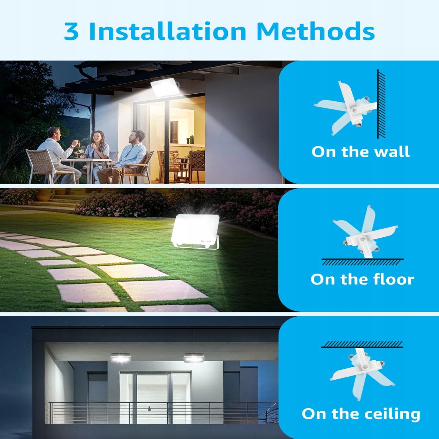 Szeroki zakres zastosowań: Dzięki regulowanemu kątowi o 180 stopni reflektor jest przygotowany do montażu na ścianie, podłodze i suficie. Reflektory zewnętrzne oferują szerokie oświetlenie dla Twojej firmy lub domu. Obejmuje to ogrody, podwórka, garaże, wille, parki, billboardy, dachy, budynki, ulice, place itp.