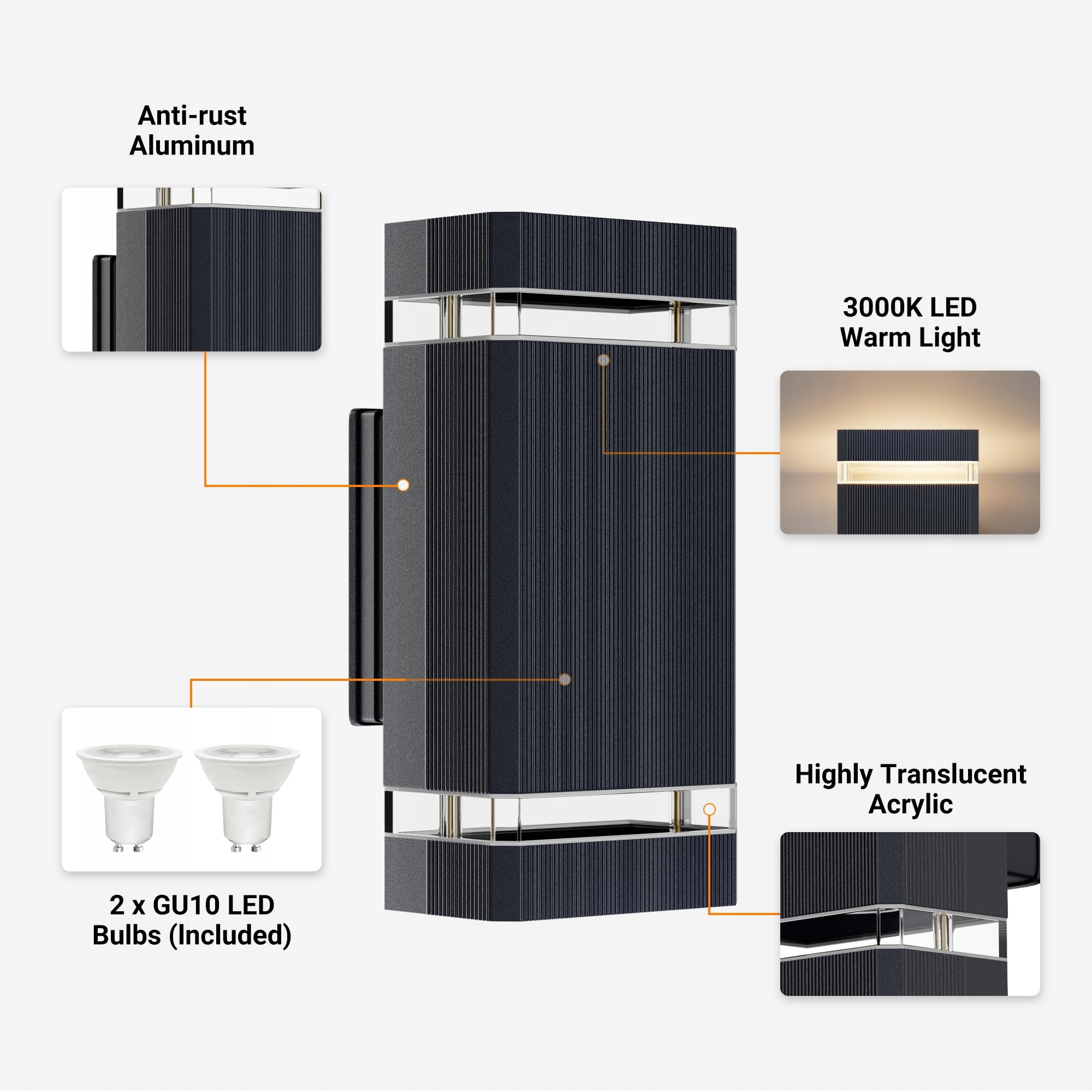 3. 【Gniazdo GU10】 Kinkiet zewnętrzny jest odpowiedni dla każdej żarówki z gniazdem GU10 (maks. 50W), wybierz swój własny kolor światła i pozwól, aby Twój dom rozbłysnął pięknym światłem.
