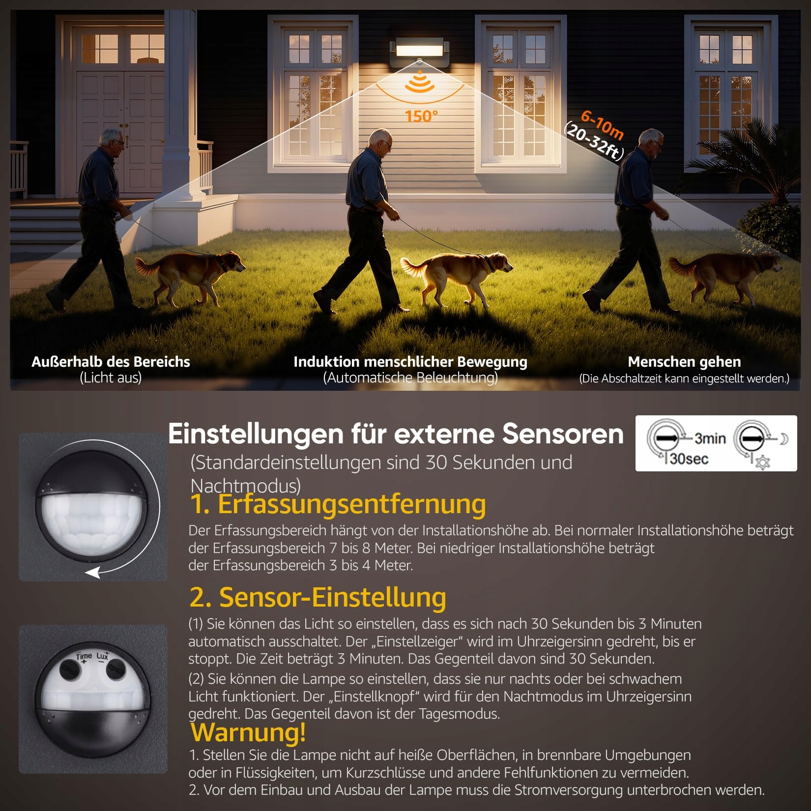 📶【Funkcja czujnika ruchu】1. 24W lampa ścienna zewnętrzna z czujnikiem ruchu, automatyczne włączanie w odległości 2m-8m. 2. Możesz ustawić czujnik tak, aby działał tylko w nocy lub aby działał zarówno w dzień, jak i w nocy (światło otoczenia: 0–1000 LUX). 3. Lampa ścienna automatycznie się zapala, gdy ktoś przechodzi obok. I automatycznie się wyłącza, gdy nie wykrywa ruchu (możesz ustawić czas wyłączania lampy od 30 sekund do 3 minut).