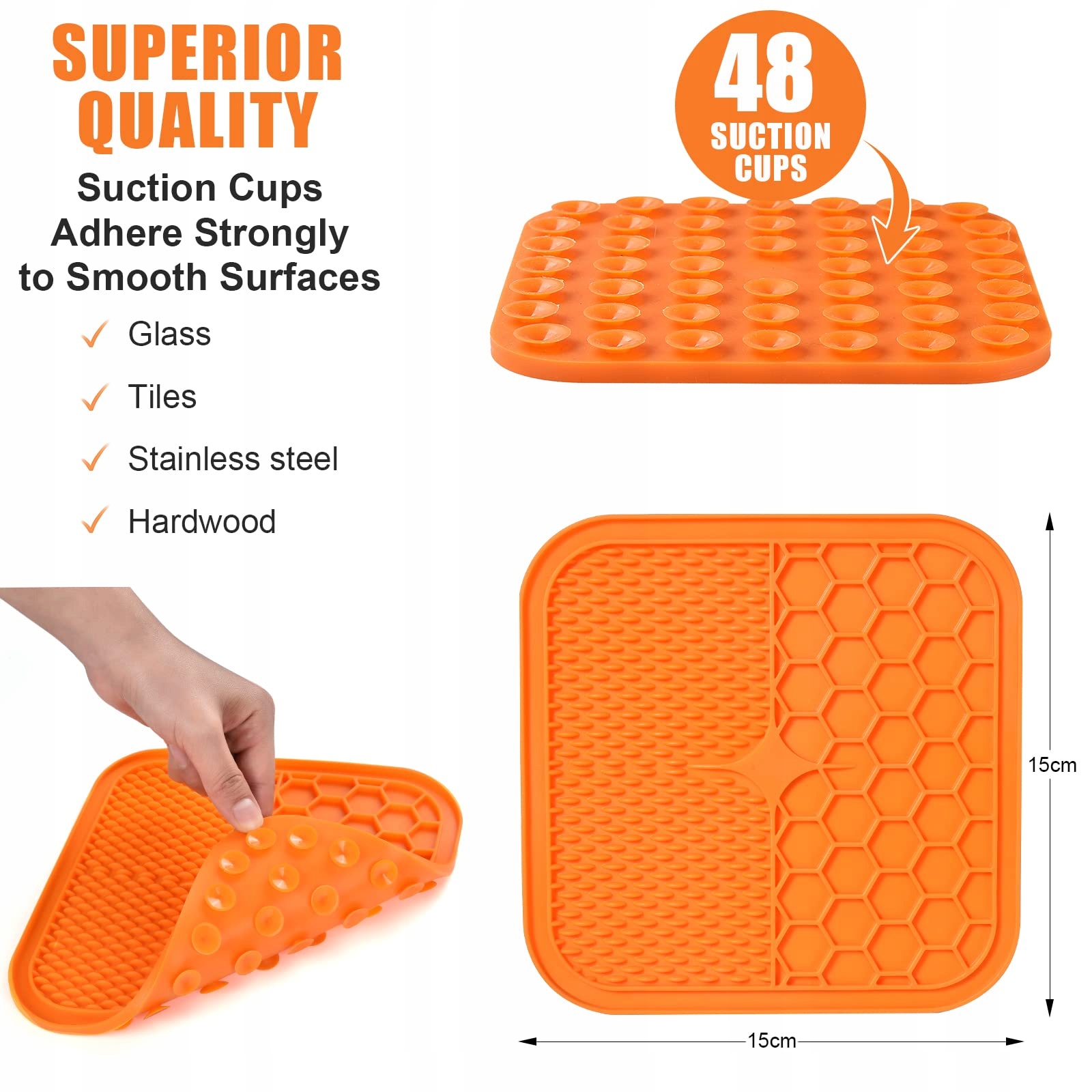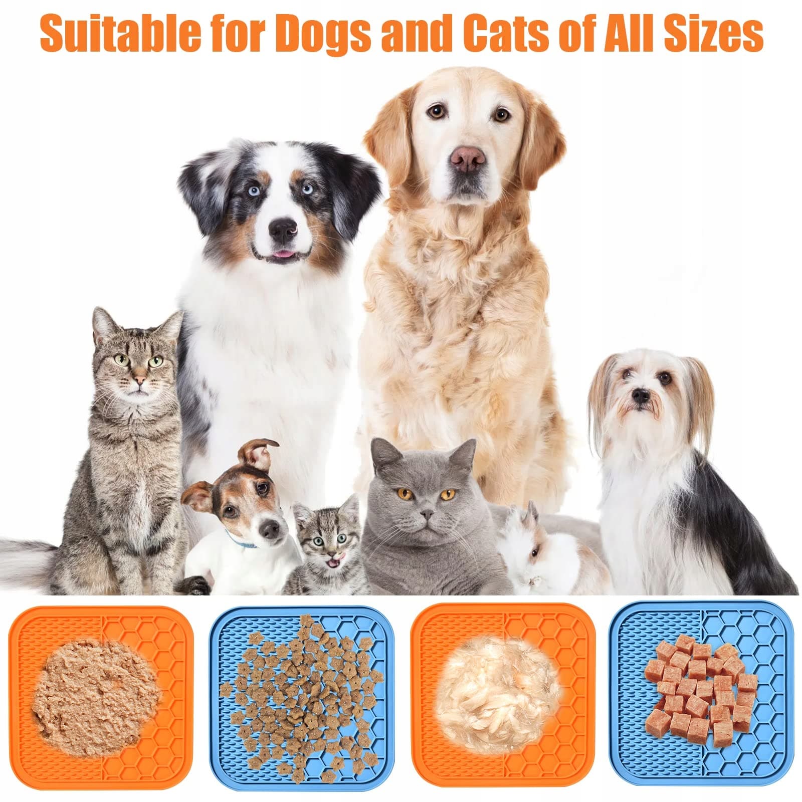 Praktyczny zestaw mat do lizania dla psa: Zawartość obejmuje 1 x niebieska mata do lizania dla psa + pomarańczowa mata do lizania dla kota, 1 x niebieska szpatułka. Mata do lizania dla psa (15 x 15 cm) posiada 48 mocnych przyssawek do mocowania na gładkich, czystych powierzchniach, takich jak wanny, blaty, szkło, płytki i ściany łazienkowe, idealna dla psów i kotów wszystkich rozmiarów.