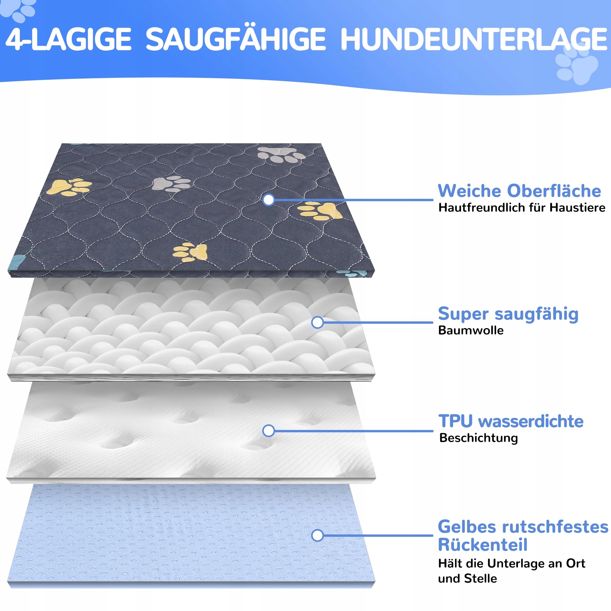 PRZYJAZNE DLA SKÓRY I ANTYPOŚLIZGOWE DNO - Nasze zmywalne podkłady dla szczeniąt wykonane są z wygodnej bawełny i PVC i składają się z 4 zagęszczonych warstw. Miękka i oddychająca powierzchnia, bardzo chłonna i szczelna wewnętrzna strona oraz antypoślizgowe dno z żelem. To antypoślizgowe dno zapewnia, że podkłady dla psów pozostają na podłodze. W porównaniu do jednorazowych wkładek dla zwierząt domowych, jest to doskonały wybór, aby zaoszczędzić pieniądze.