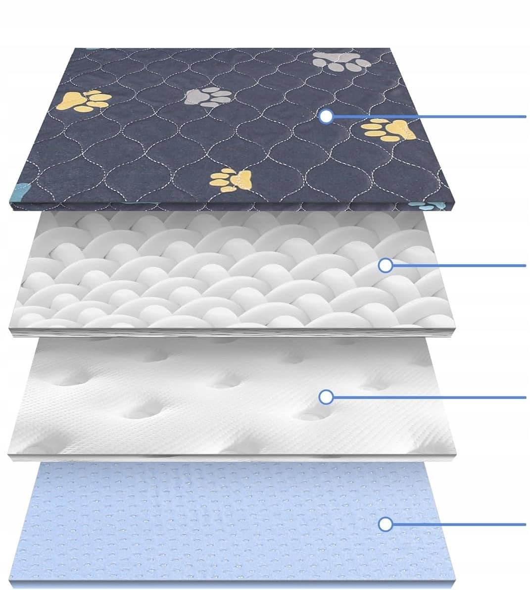 Super chłonne i szczelne - Podkłady treningowe dla szczeniąt są bardzo chłonne i szczelne. Podwójnie zagęszczony materiał wewnętrzny może silnie absorbować wodę i skutecznie zapobiegać wyciekom, dzięki czemu szczenięta i podłoga pozostają czyste i suche. Zawsze twórz przyjemne środowisko dla swojego szczeniaka.