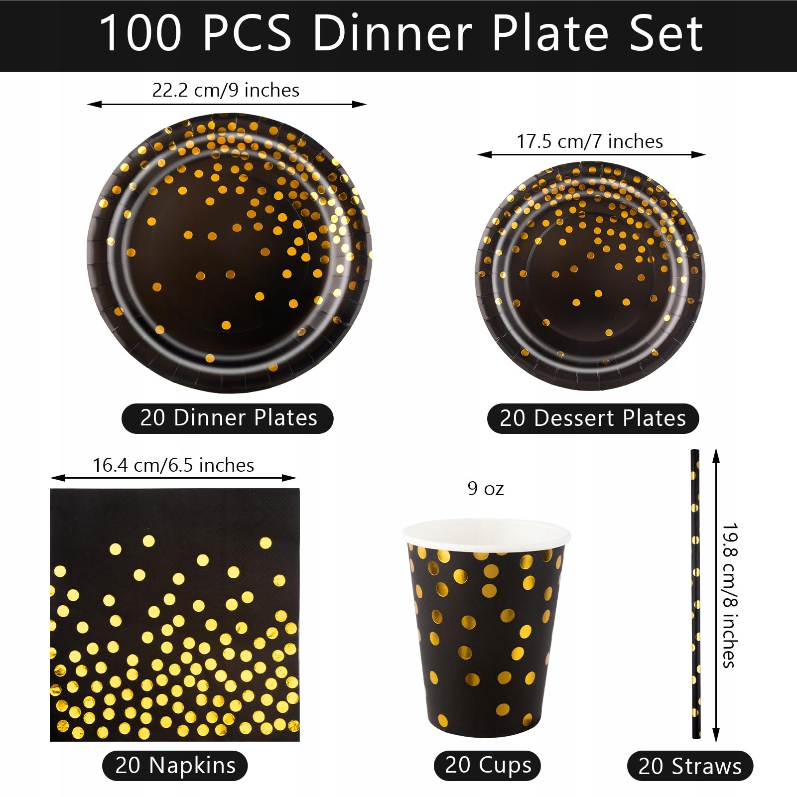 Zestaw naczyń 100-częściowy zawiera 20 talerzy 9-calowych, 20 talerzy przystawkowych 7-calowych, 20 serwetek, 20 papierowych kubków oraz 20 słomek. Może bez problemu obsłużyć 20 gości