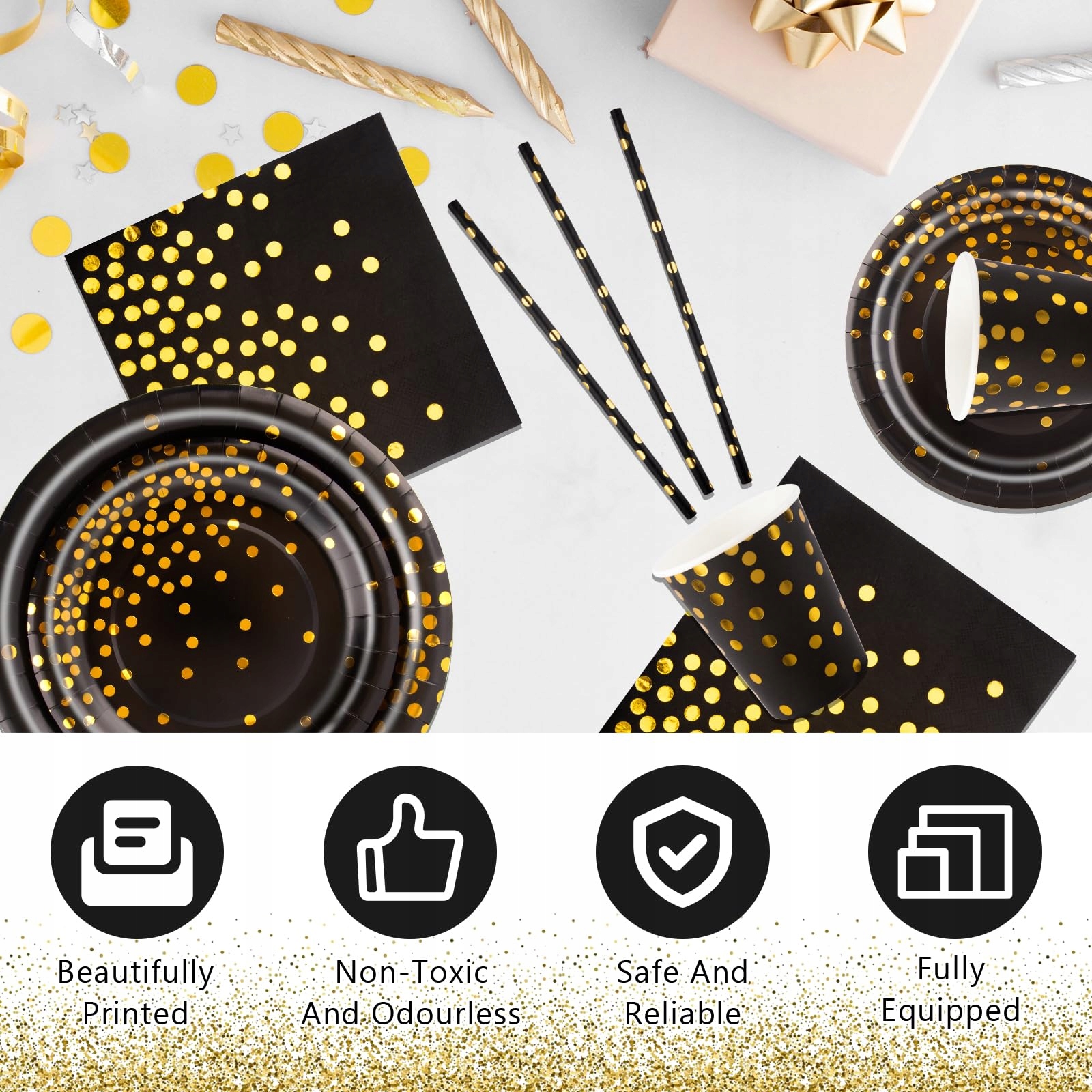 AITSITE Zestaw Talerzy Papierowych Czarny Złoty Na Urodziny i Wesela